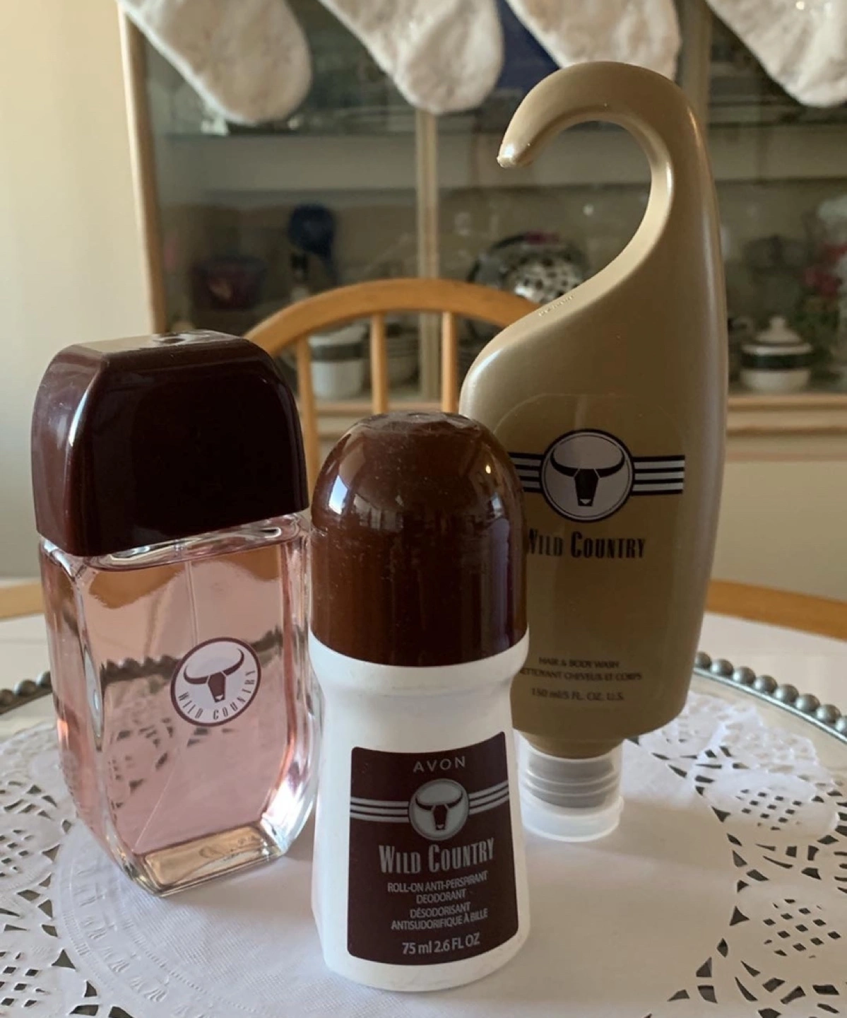 Avon Wild Country cologne, deodorant, and body wash. Set includes a bottle of cologne, a roll-on deodorant, and a body wash.