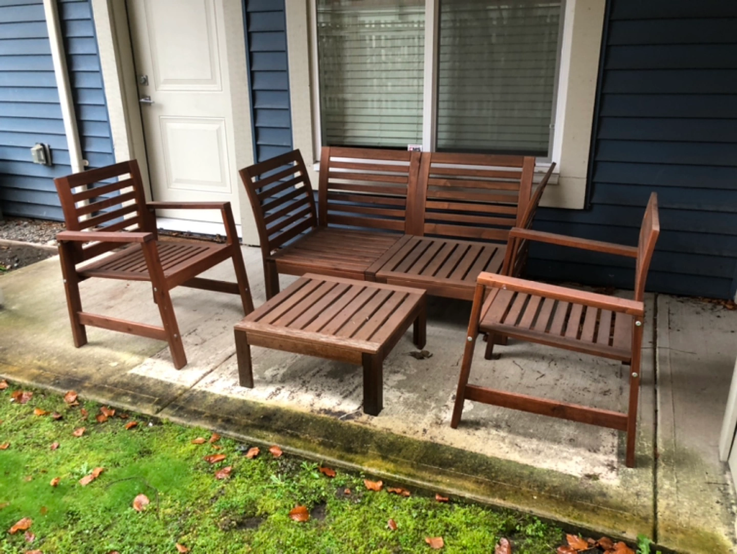 4 piece patio furniture set, including 2 chairs, a loveseat, and a coffee table. Made of wood. Located in Willoughby Heights, Langley.