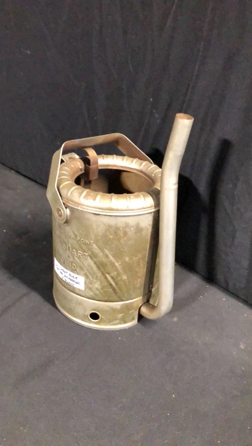 75Metal oil can with a long spout and a handle. It is marked with Swingspout on the side. One quart capacity. $35 each