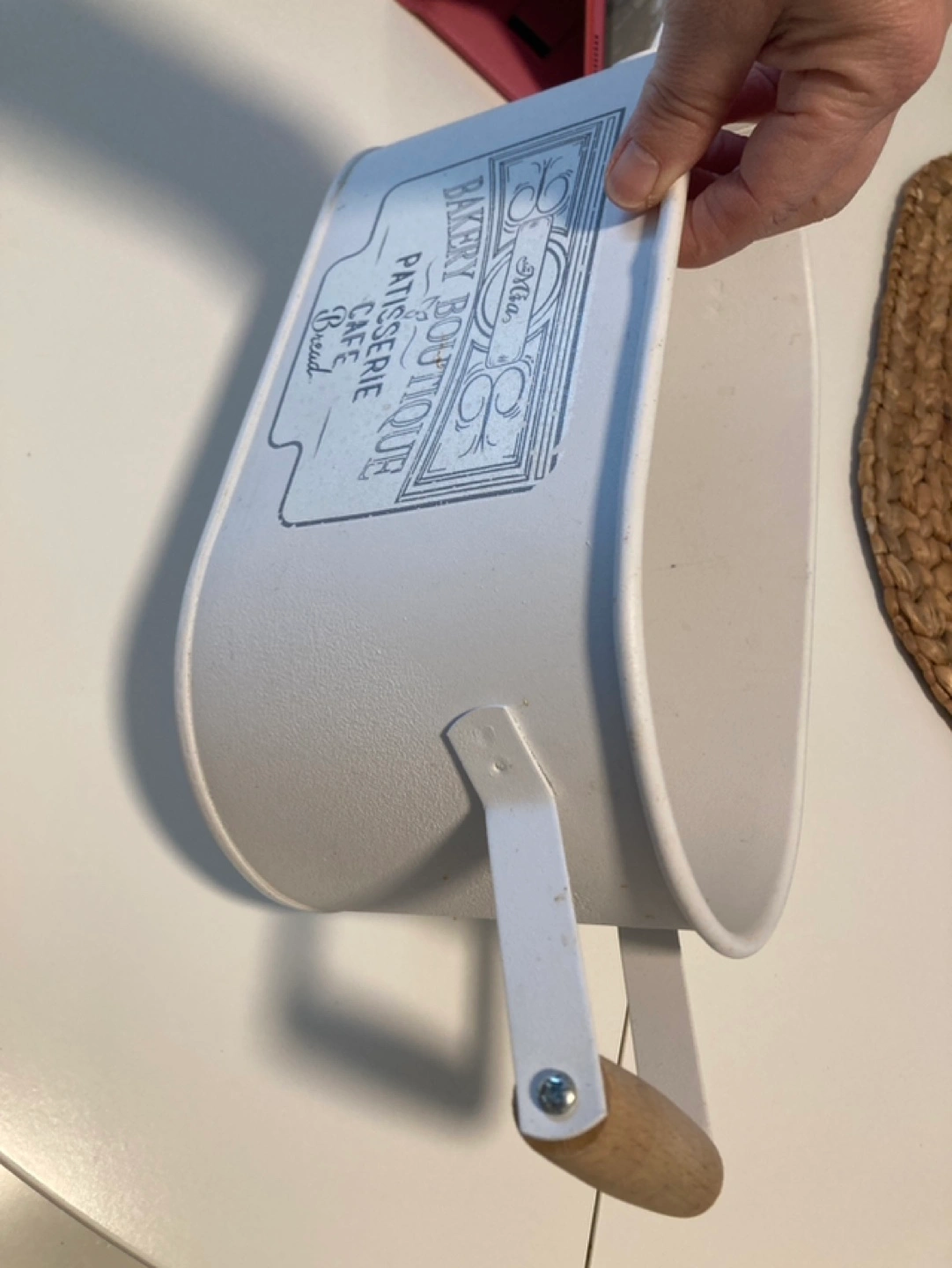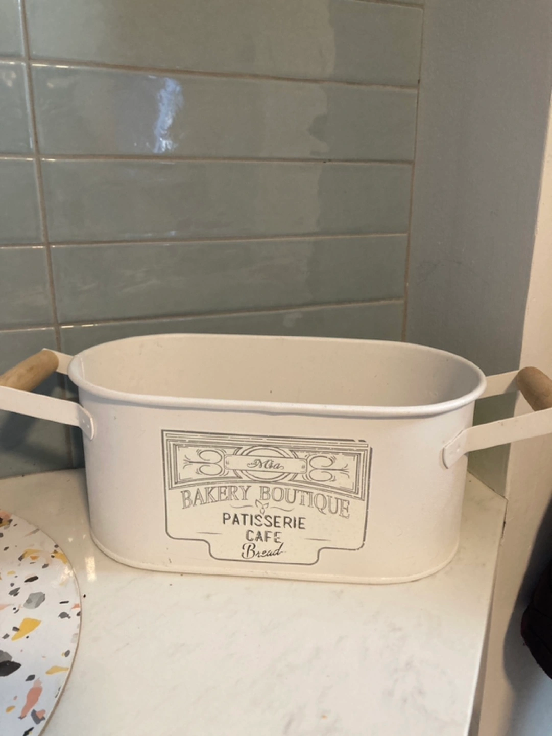 353Oval-shaped bread bin with wooden handles. Features a vintage-inspired design with a bakery logo. Perfect for storing bread, pastries, or other kitchen essentials.