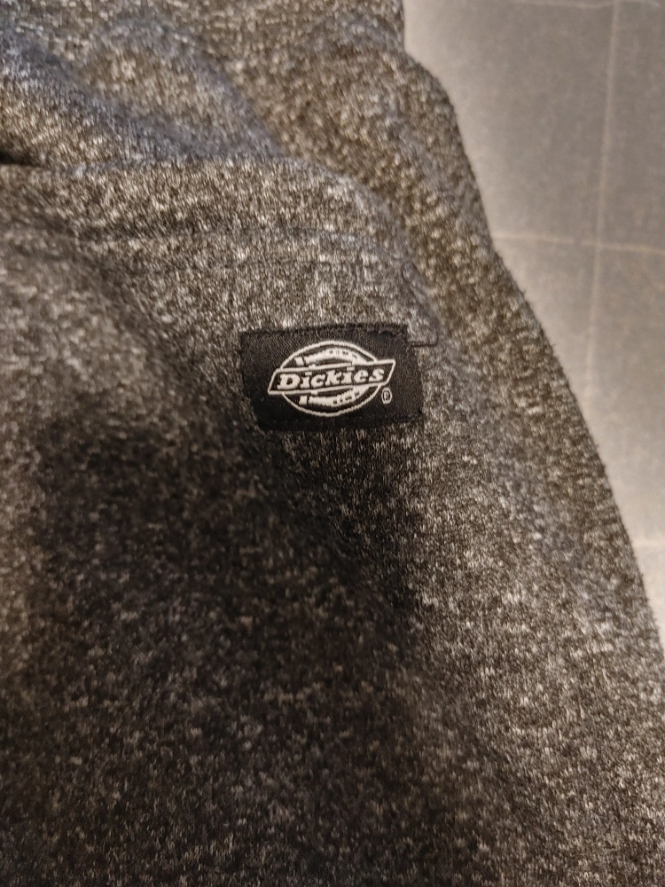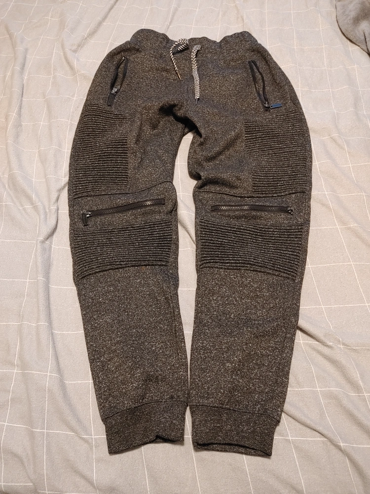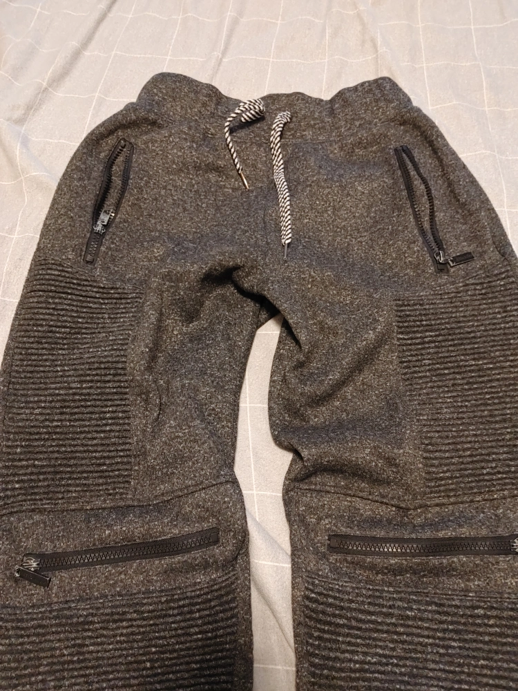 Grey jogger pants with zippered pockets and a drawstring waistband.