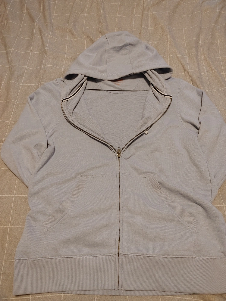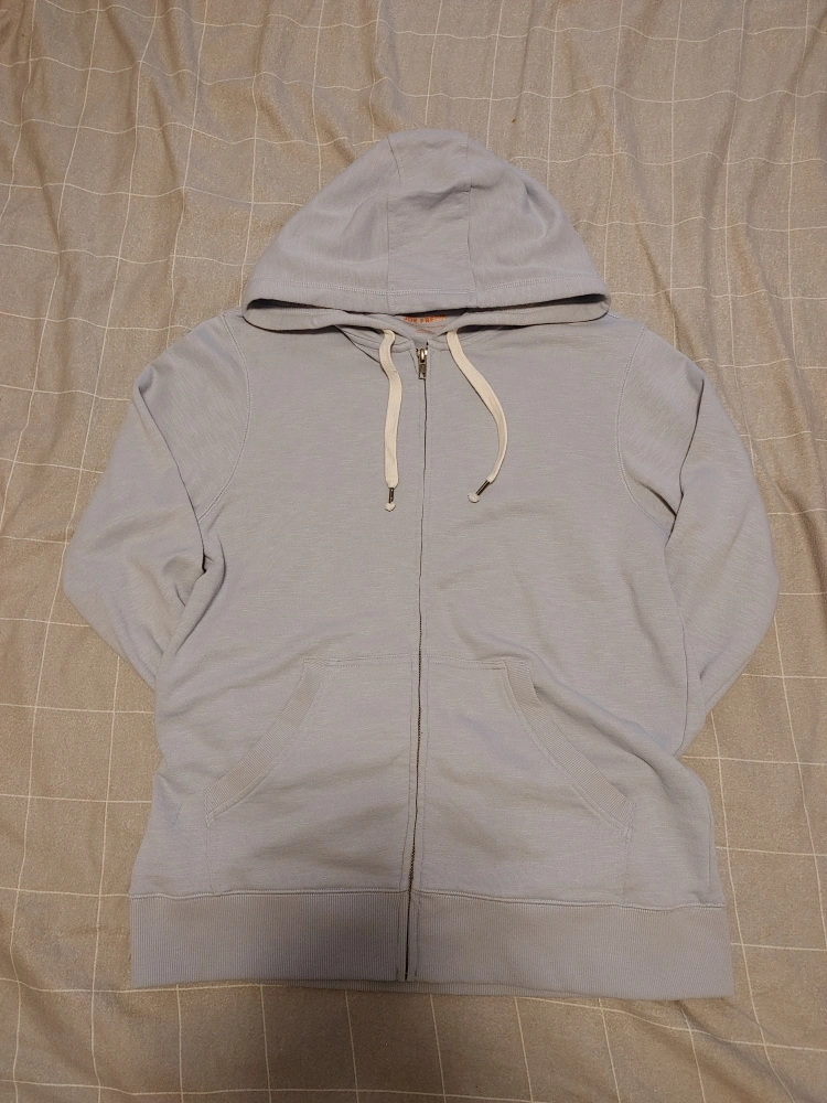Light blue zip-up hoodie. Features a hood with drawstrings, a front pouch pocket, and ribbed cuffs and hem.