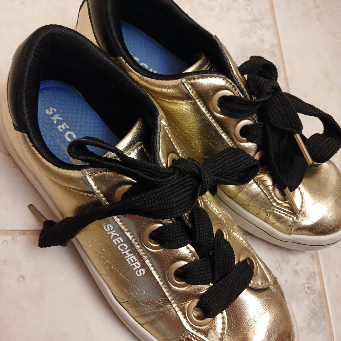 Sketchers metallic Gold sneakers, size 4 . (EU36) Black laces. Leather upper, synthetic sole. some crinkling on the gold. Smoke-Free home! PICK UP ONLY AT KEELE AND FINCH