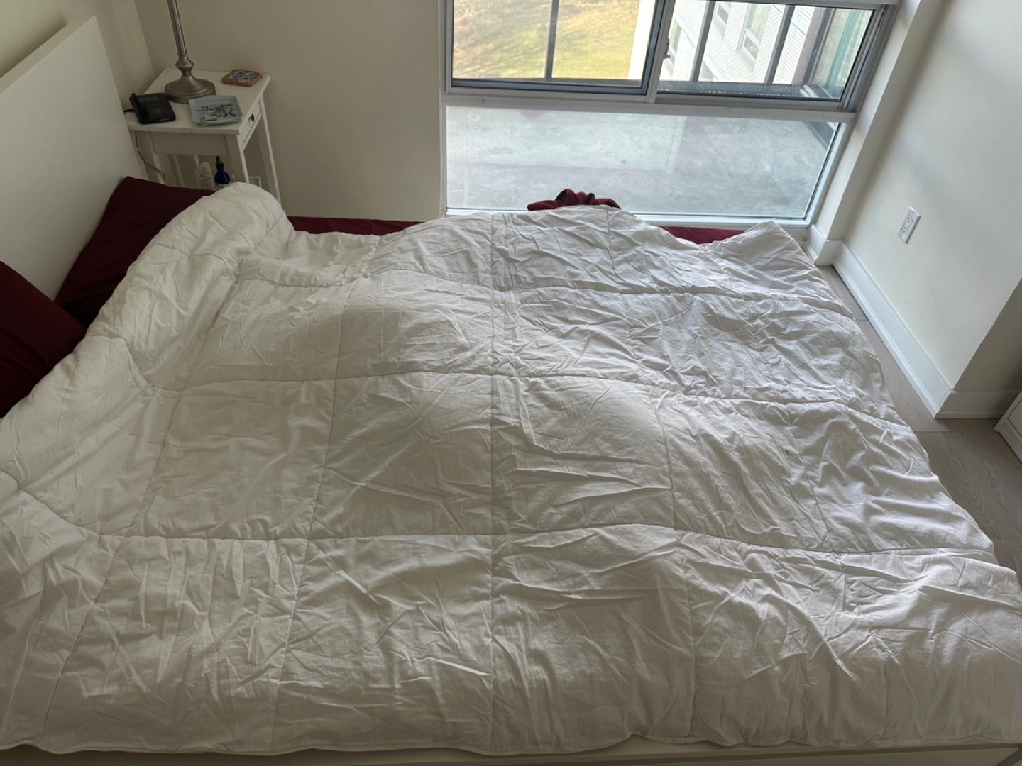 White down alternative duvet. Machine washable. Middle warmth, bot too cold or too hot. Light weighted Size 74 x 98 in / 188 x 249 cm Slightly used Pick up Yonge and Finch