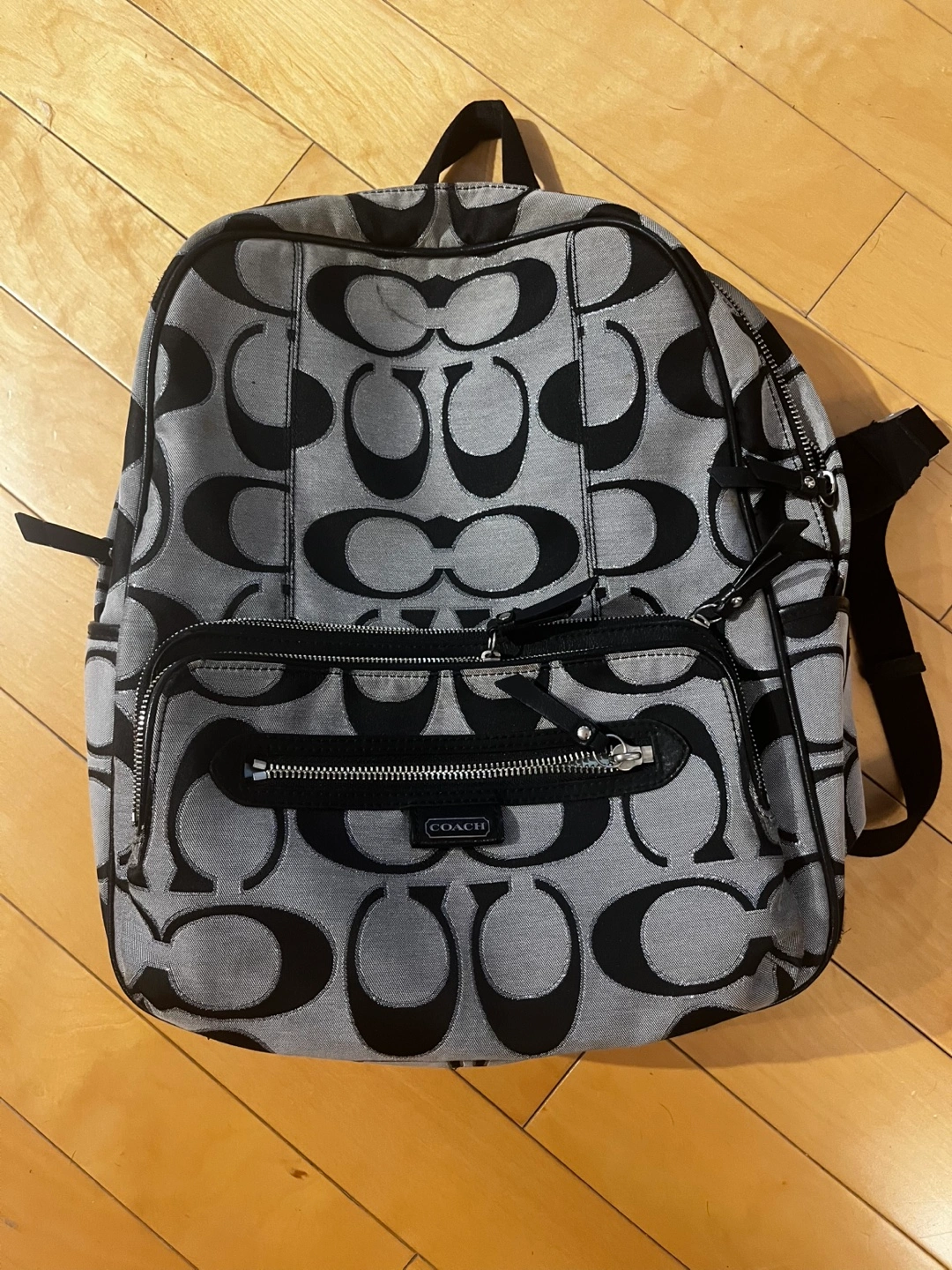 Grey and black Coach signature print backpack. Lots of storage compartments.