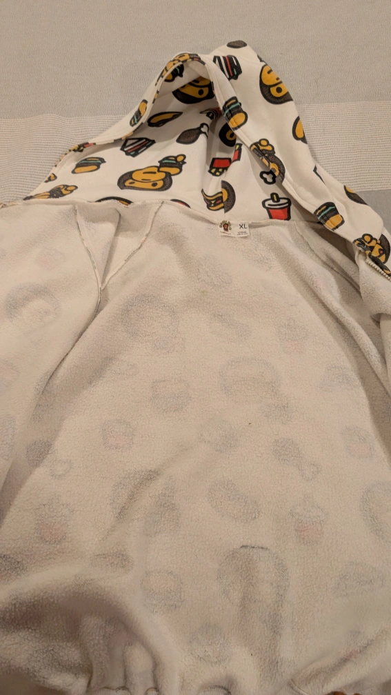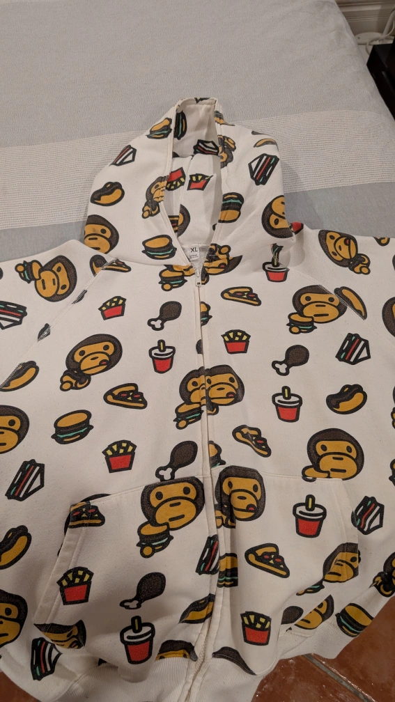 White hoodie with a food print. Size XL. Made in Japan. Does not zipper up all the way. Used but Great Condition.