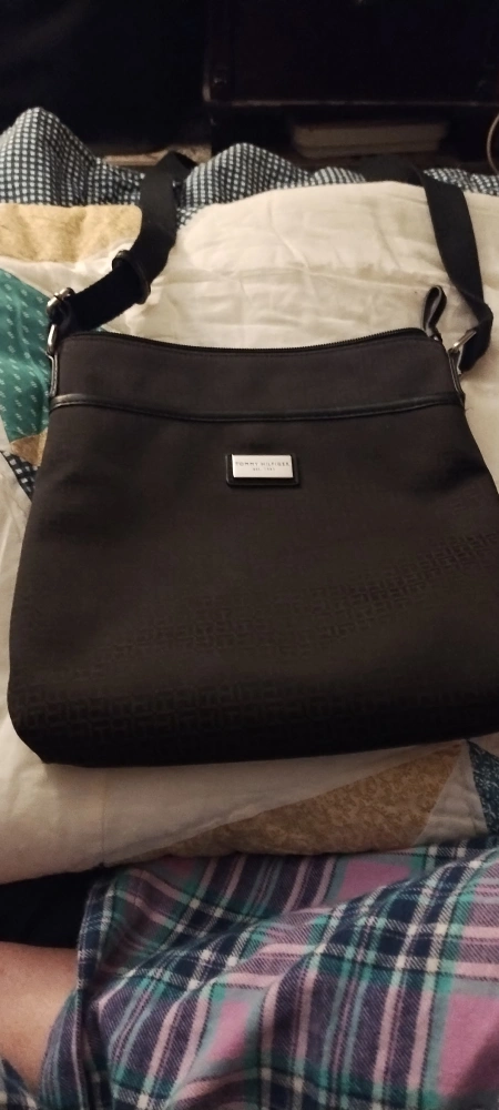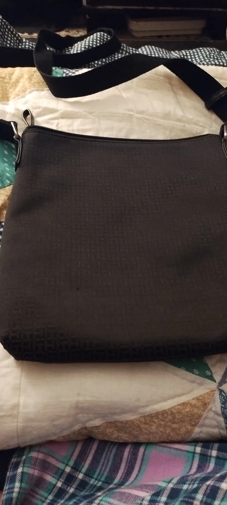 105Black crossbody bag with adjustable strap. Has a zipper closure. Small size.