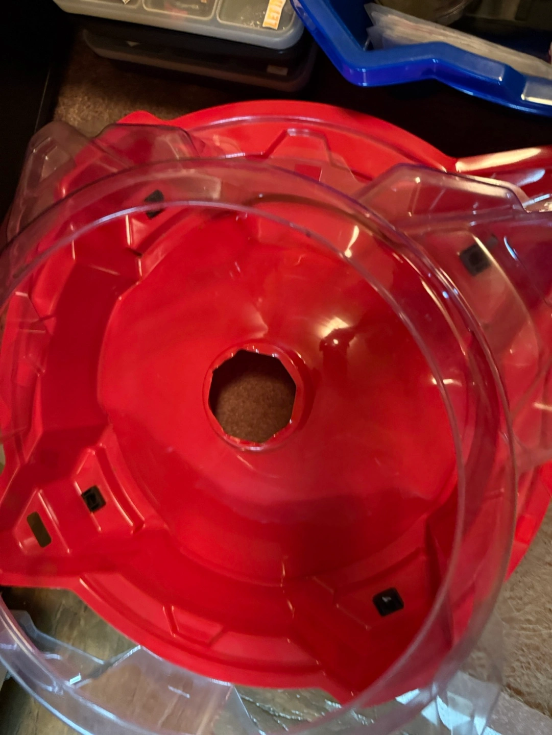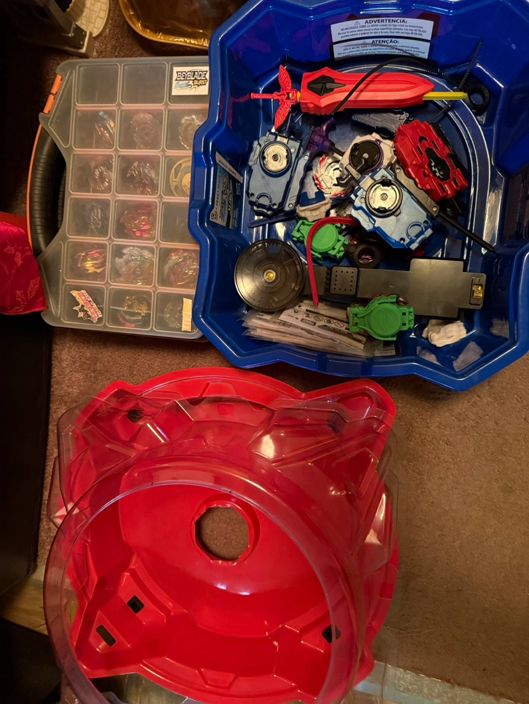 Includes a blue Beyblade Burst arena, a red Beyblade Burst arena, and a variety of Beyblades. Also includes a clear storage case with dividers.