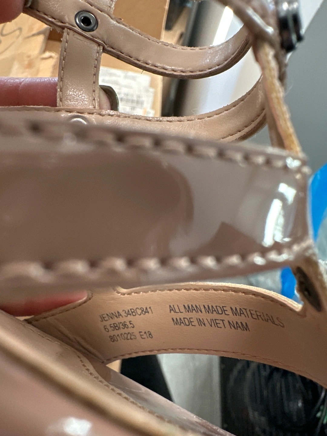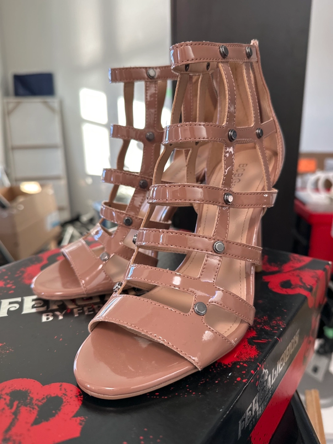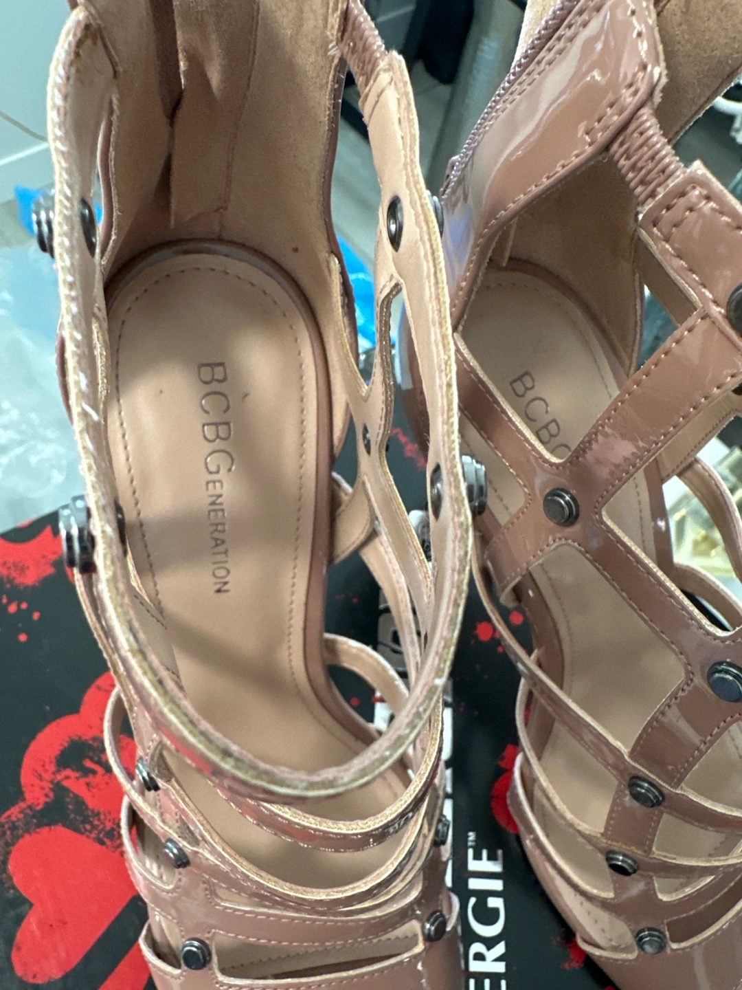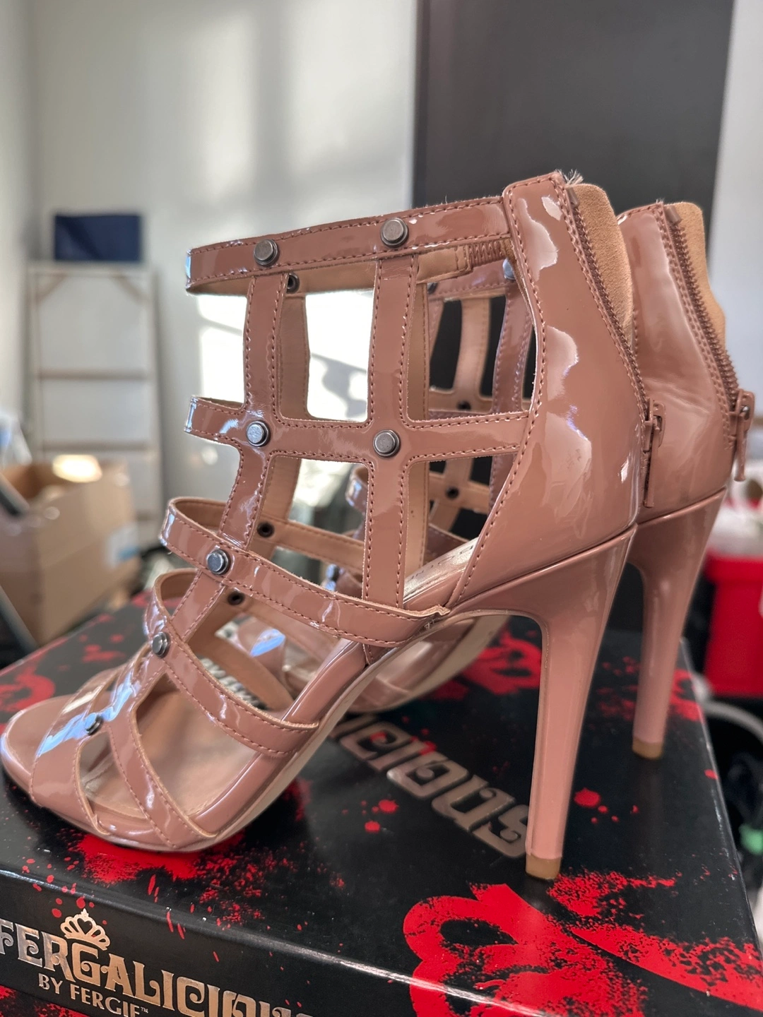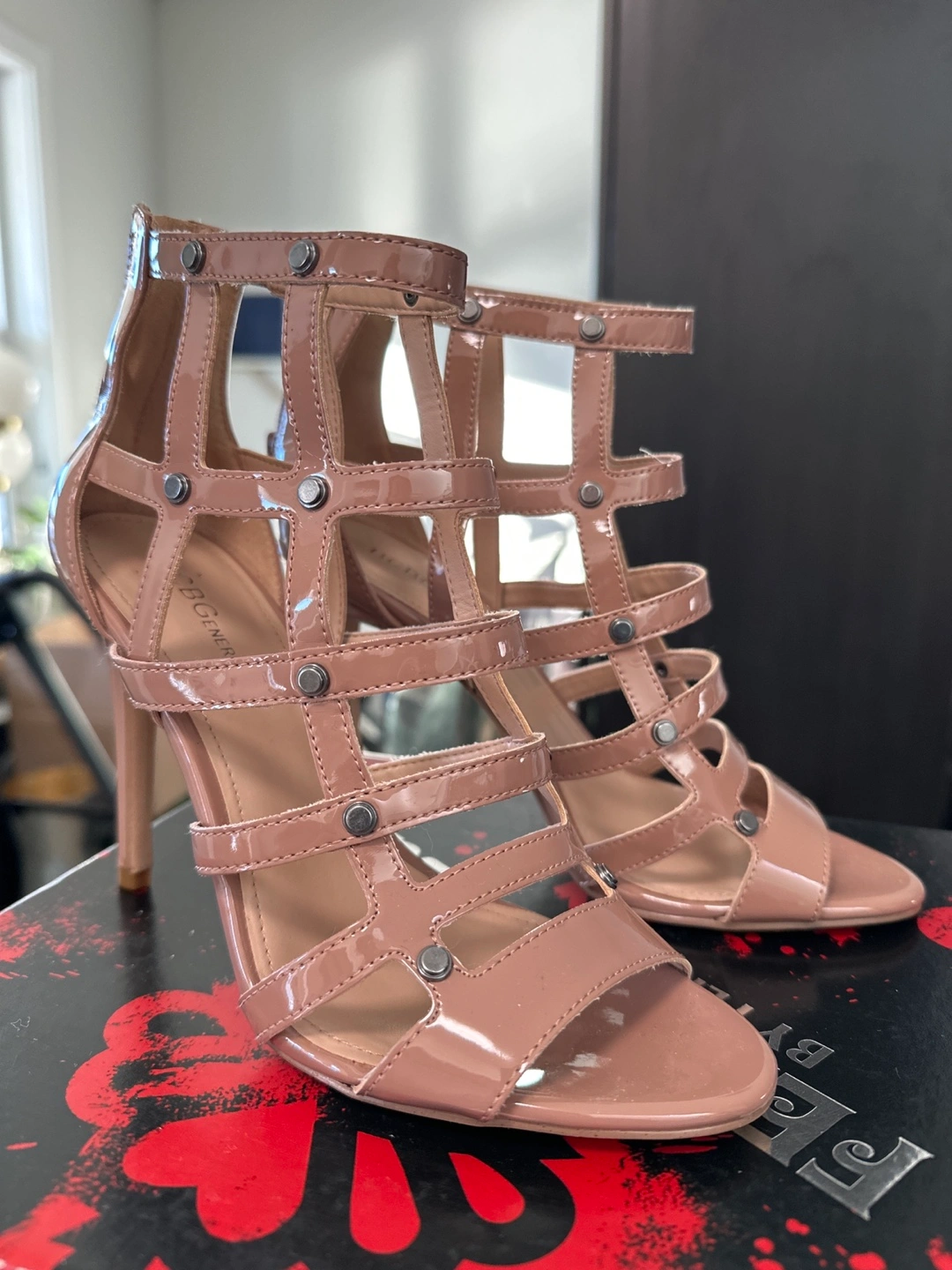 Nude patent-heeled sandals with studded accents. Zip closure on the back of the shoe. Great for party