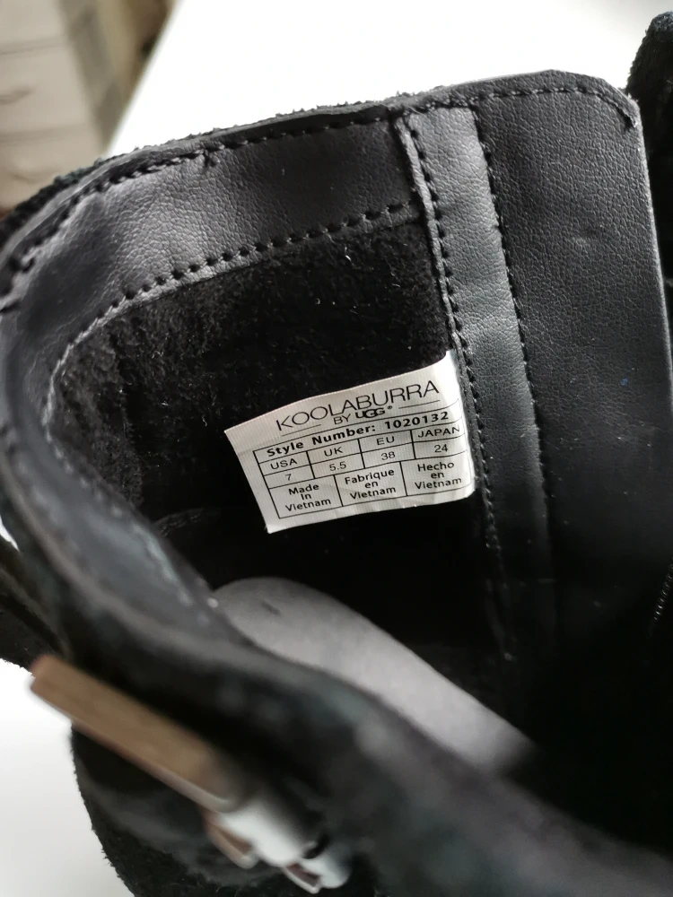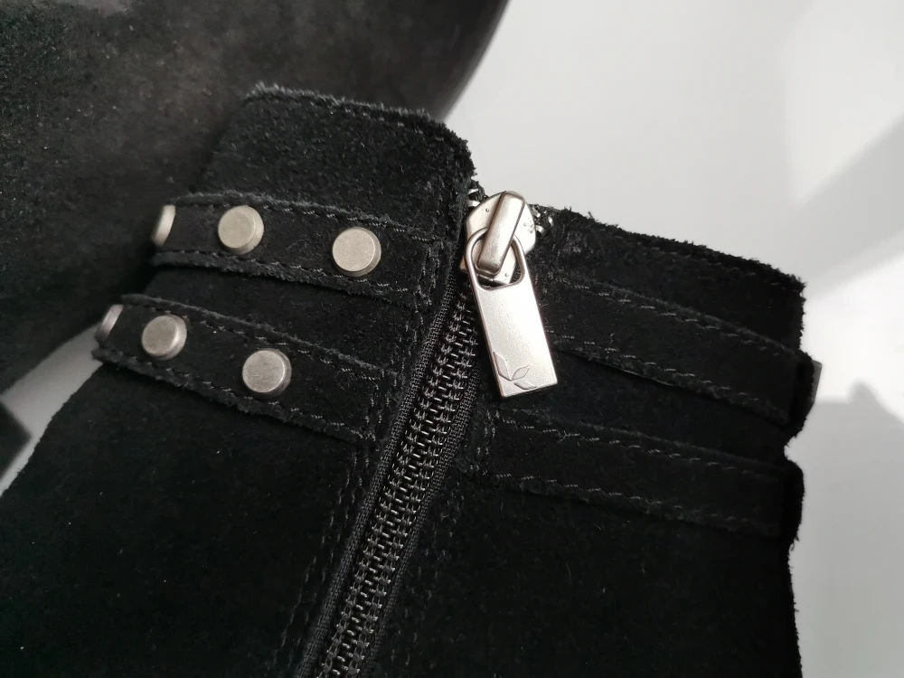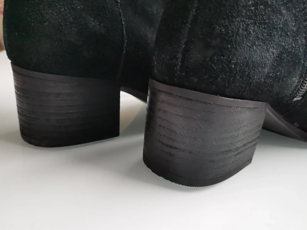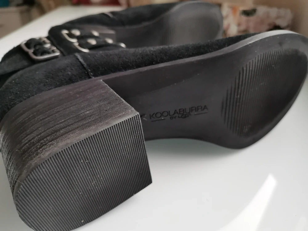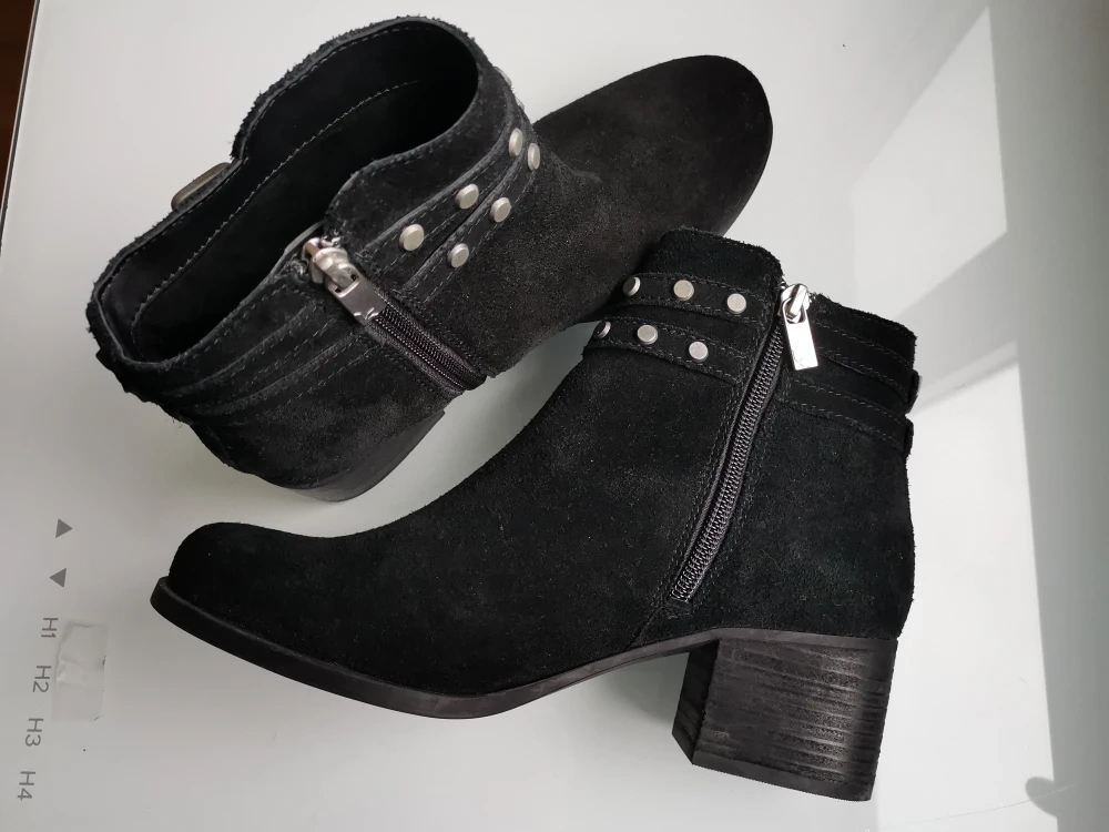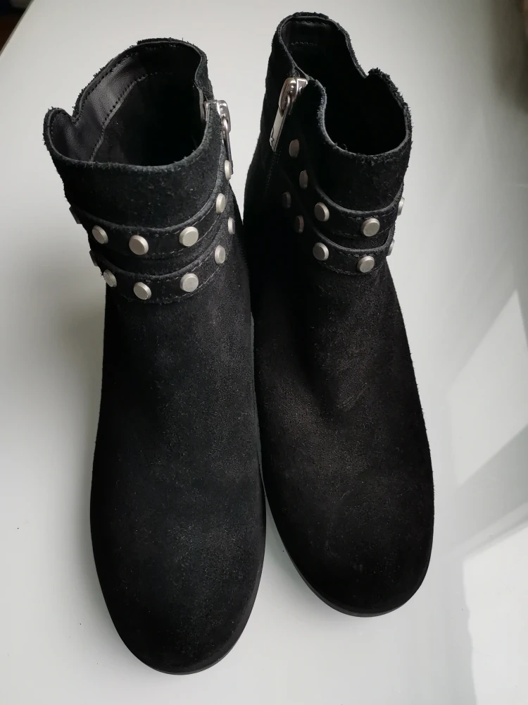 Black suede ankle boots with buckle detail and a block heel. Zipper closure on the inside of each boot. Received as a gift. Not my style so never worn.