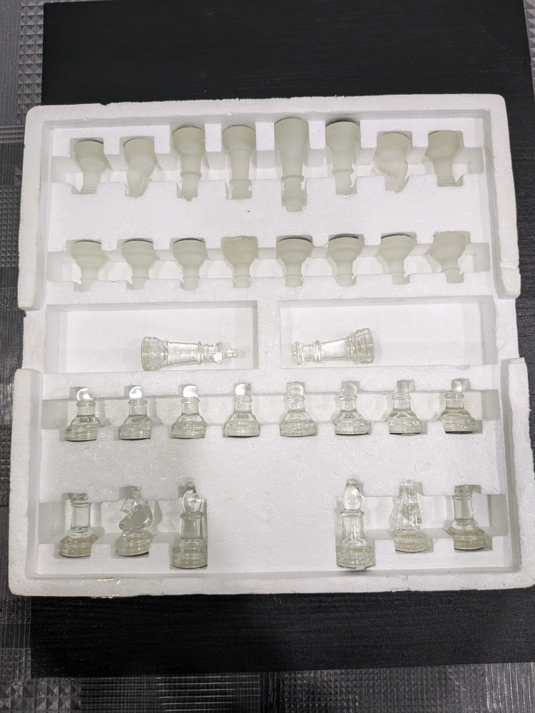 Glass chess and checkers set. Includes a 14 inch smoked glass board and frosted glass pieces. The king is 3 inches tall.