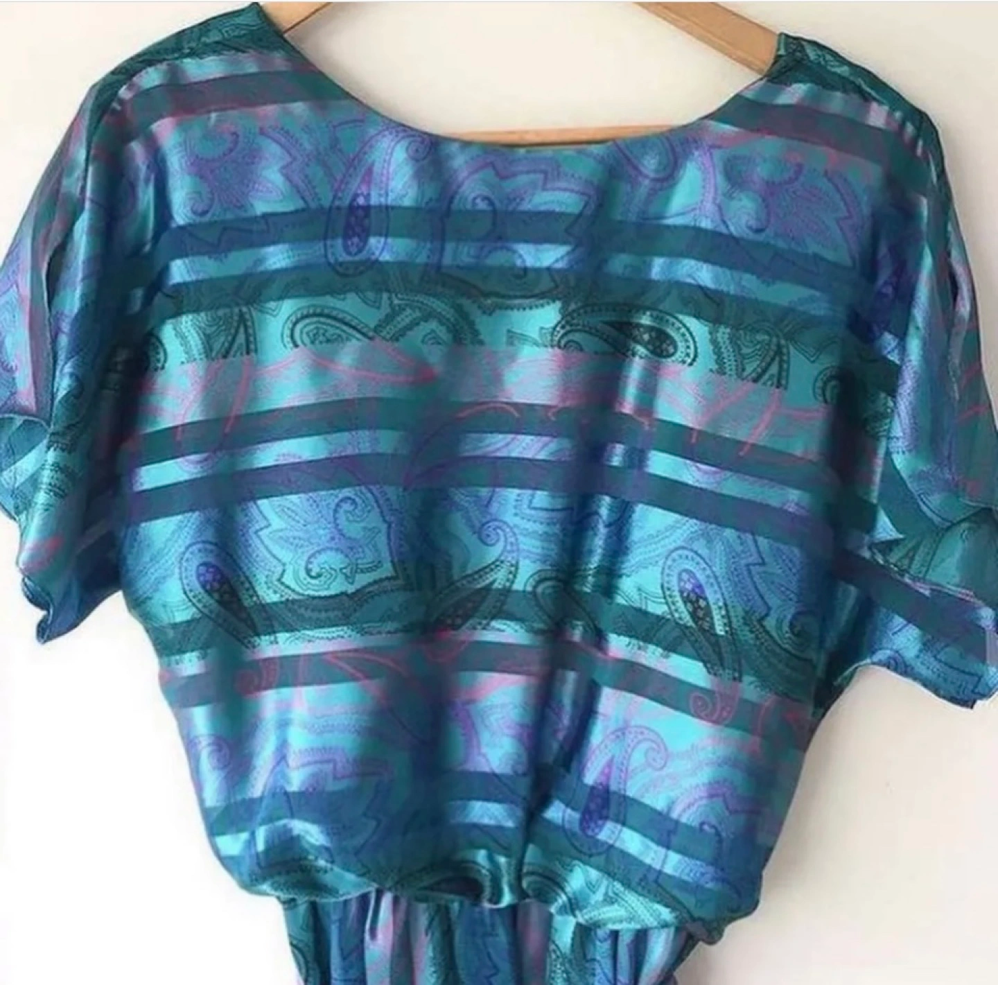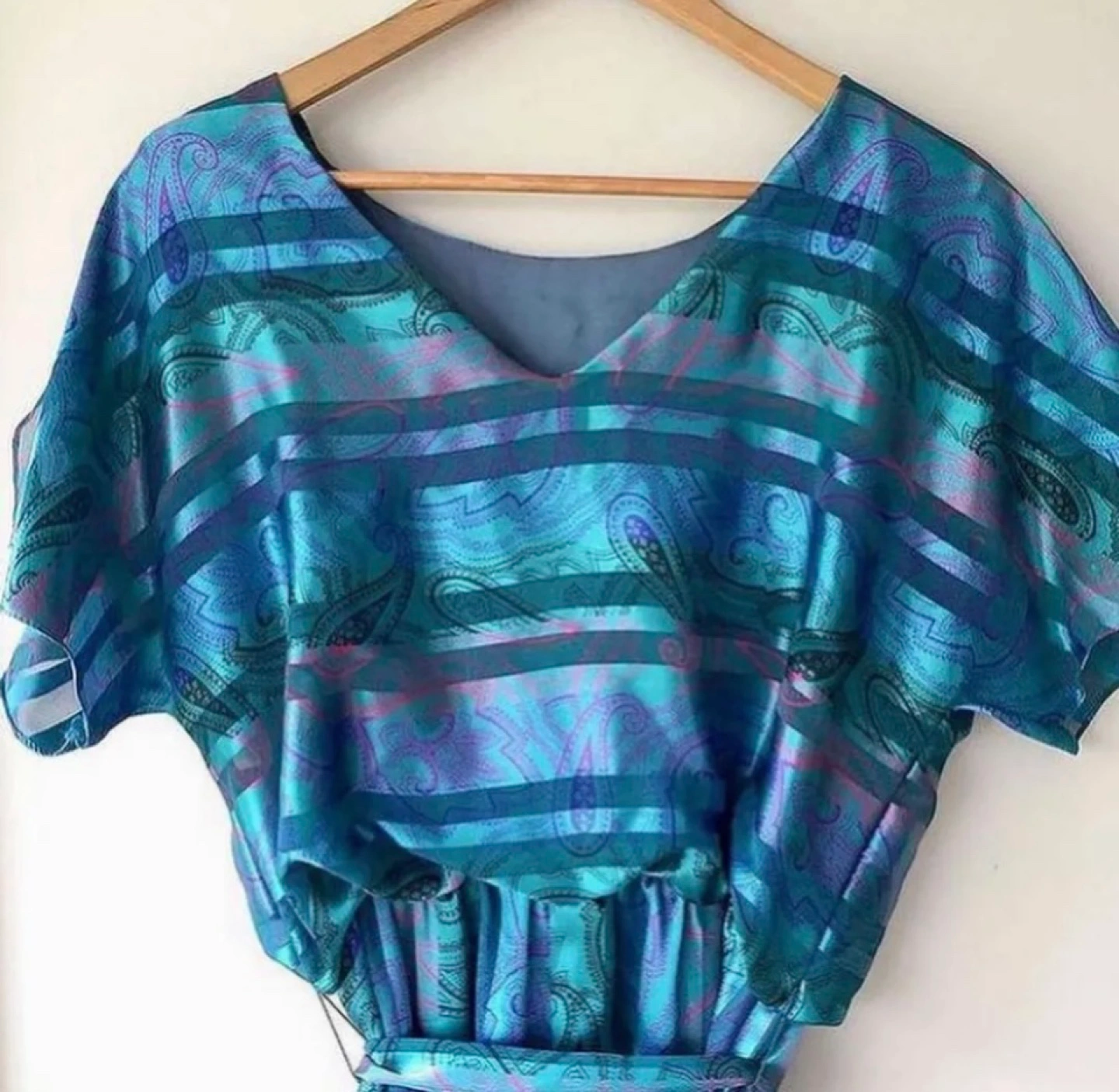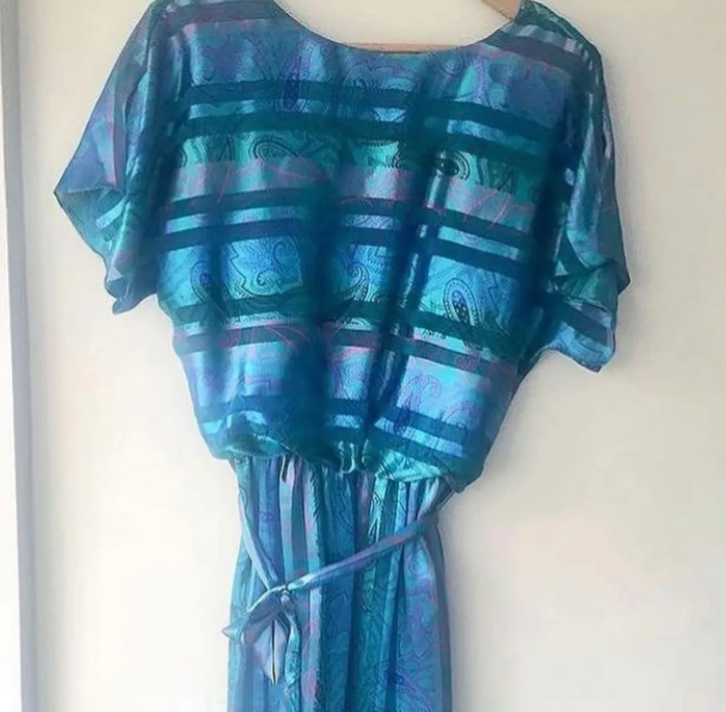 Absolutely stunning blue Vintage Algo-Ette's dress, blue paisley pattern with stripes. Short sleeves, V neck, and tie at the waist.
