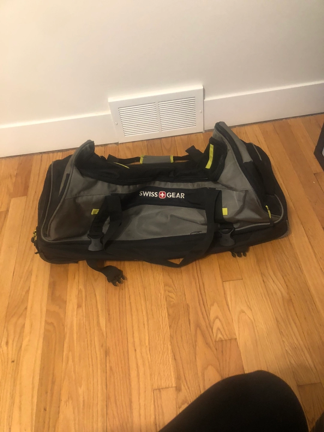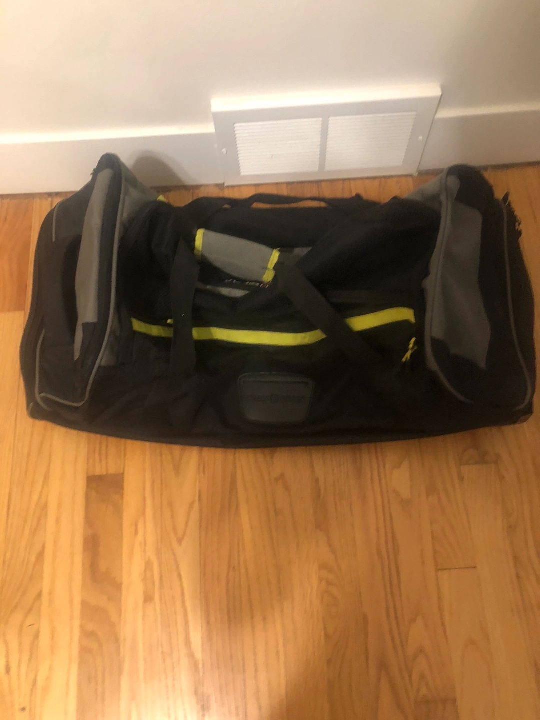45Black, grey, and yellow duffle bag. Large, with wheels and a telescoping handle.