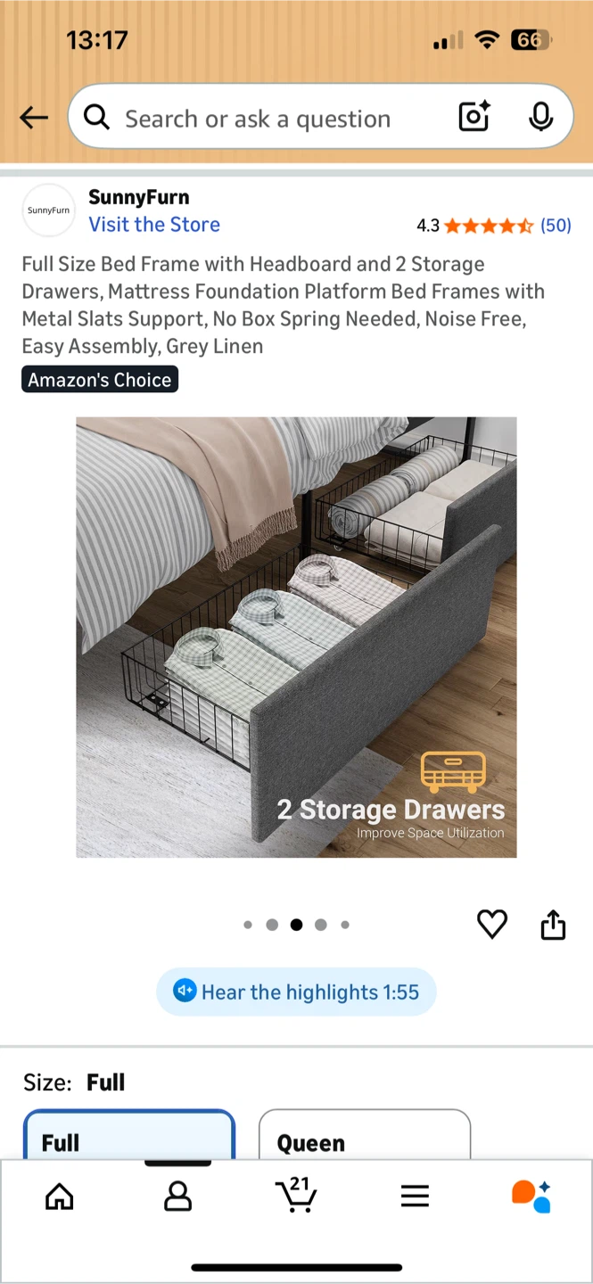 Selling a SunnyFurn full-size bed frame that is almost new! It comes with a headboard and two storage drawers, perfect for maximizing space! The frame has a mattress foundation platform with metal slats for support.