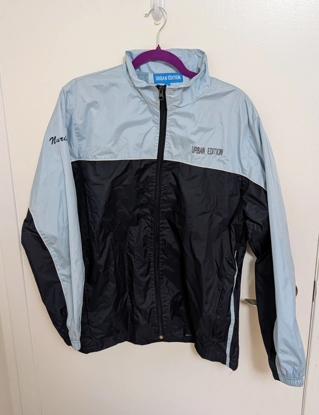 Urban Edition Colour Block Windbreaker Jacket - Women's Size Medium Lightweight windbreaker jacket from Urban Edition. Features a colour block design in blue and black. Includes embroidered name details on the sleeve and back, but hoping someone can remove to reuse.