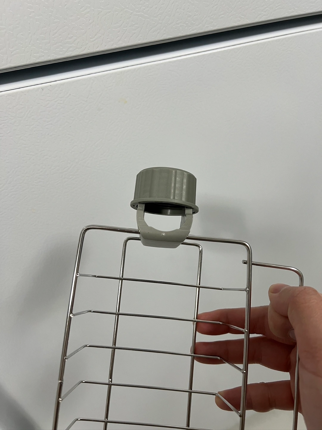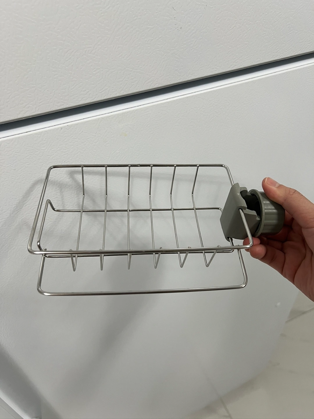 Metal under cabinet storage shelf with a clip for easy attachment. Ideal for storing small items like spices or cleaning supplies.