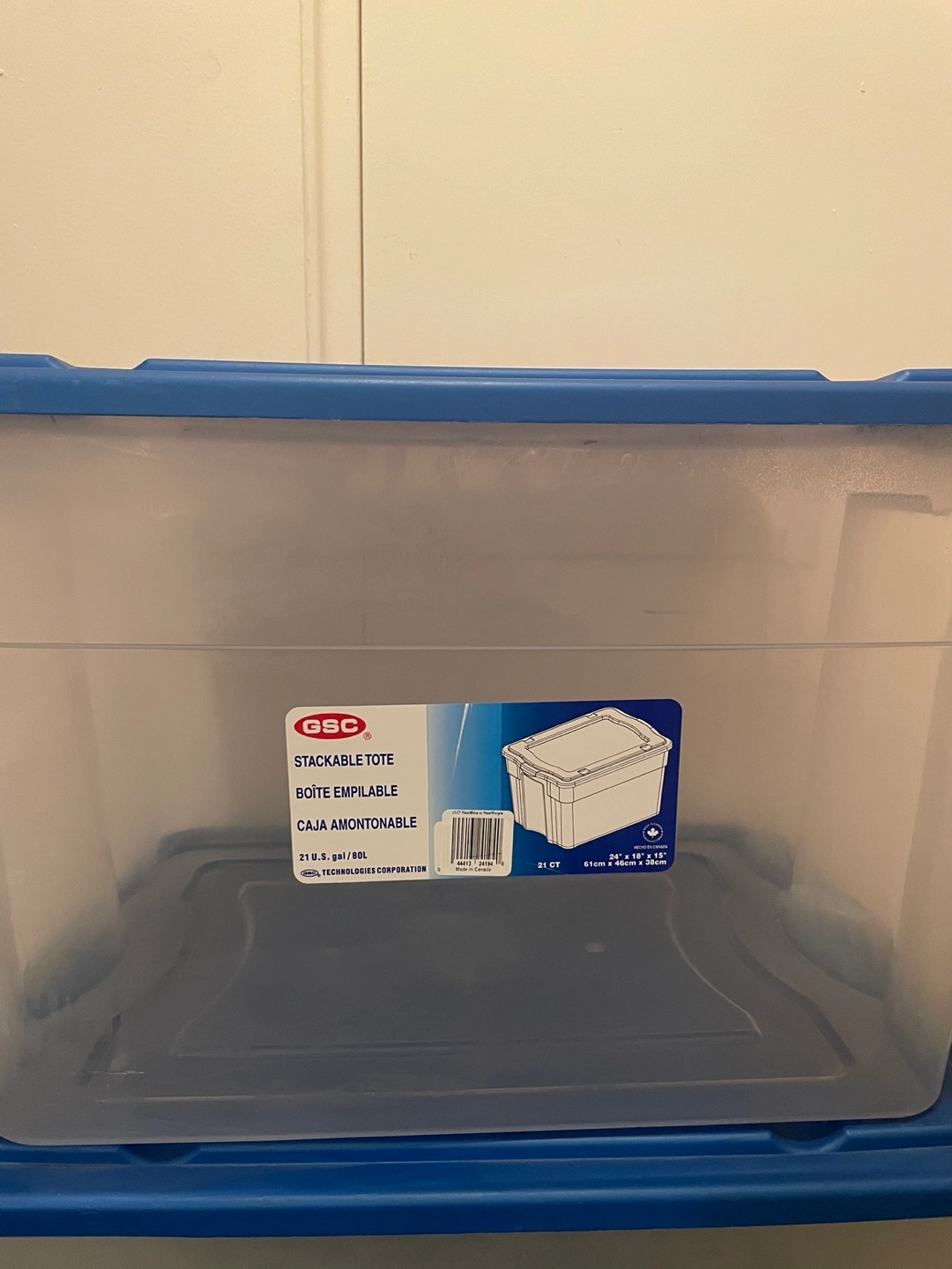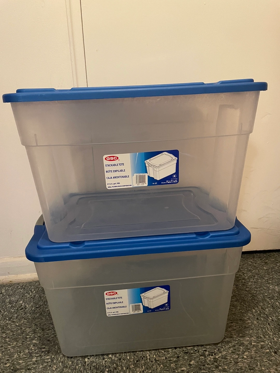 Clear plastic storage totes with blue lids. Stackable. 21 gallon/80L capacity