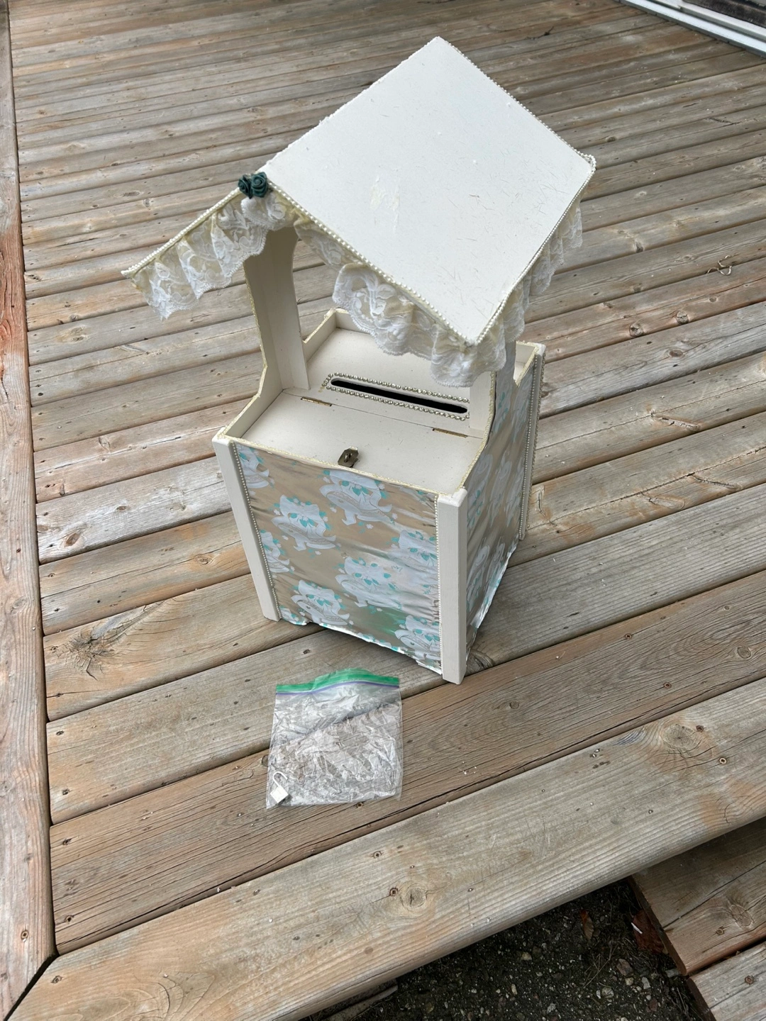 Hand made wooden wedding card box with a roof and lace trim. The box has a wrapping paper lining. Can be removed. hinged lid with a lock. Includes key.