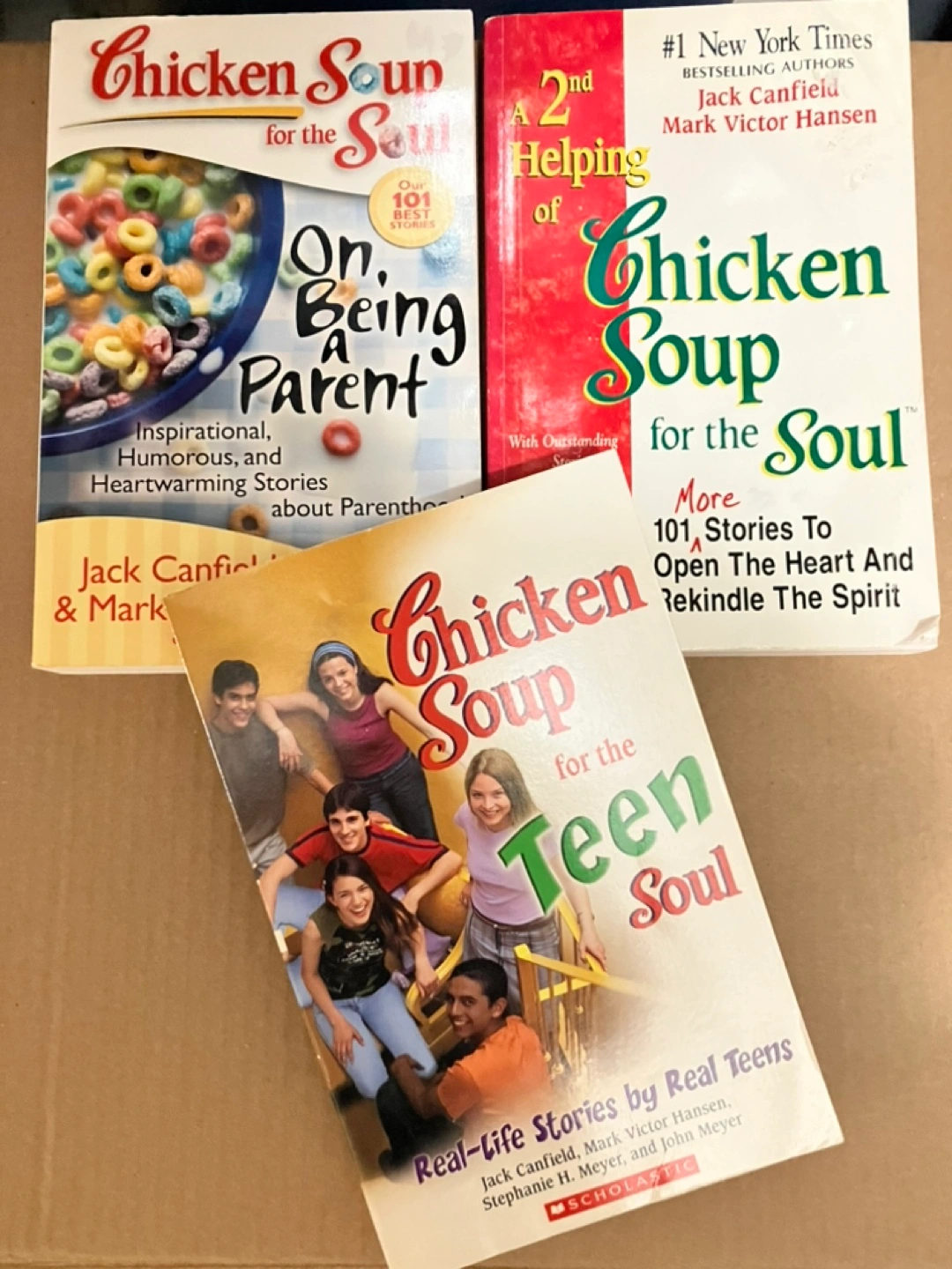 Chicken Soup for the Soul series books. Includes On Being a Parent, a 2nd Helping of Chicken Soup for the Soul, and Chicken Soup for the Teen Soul.