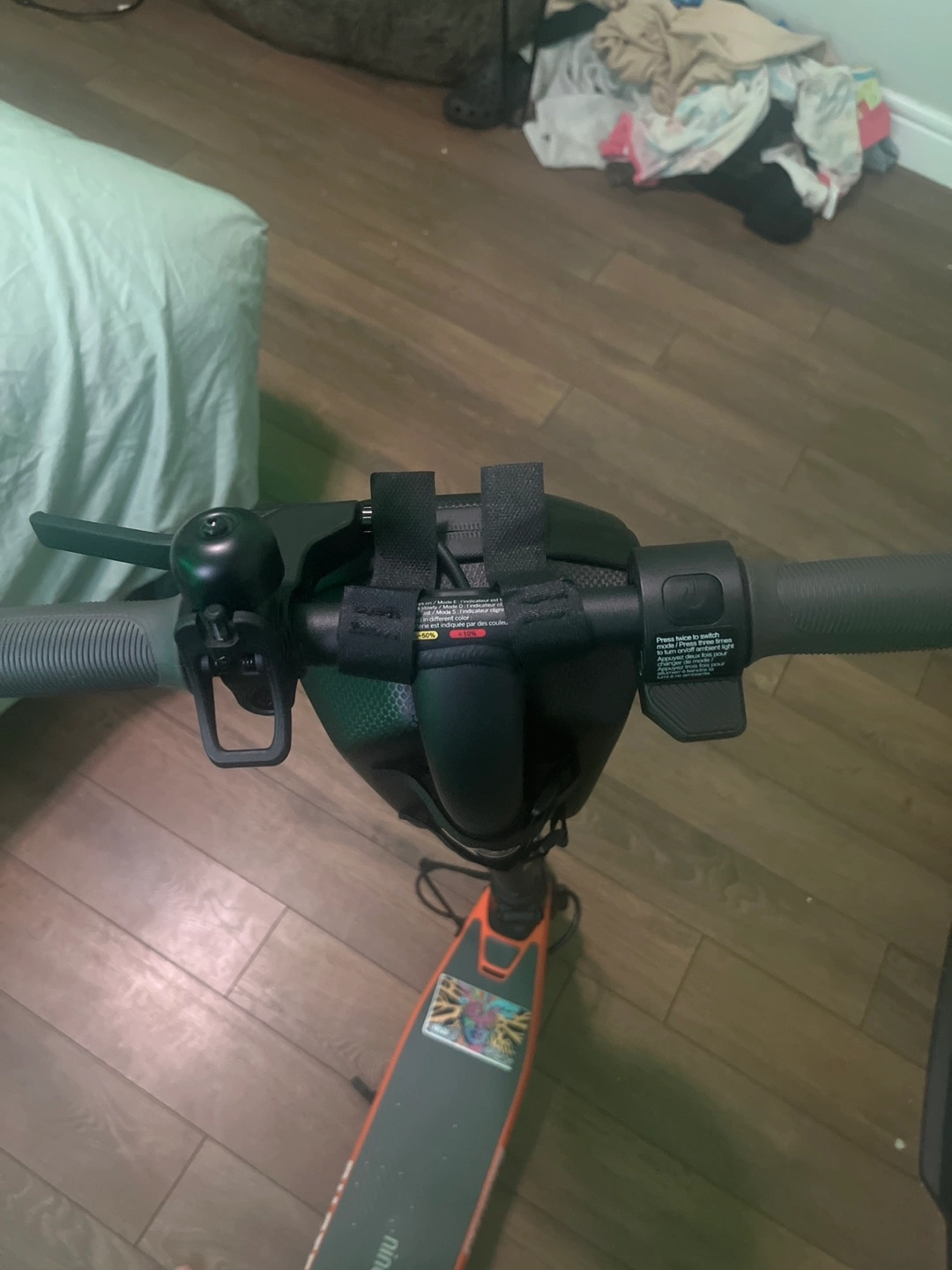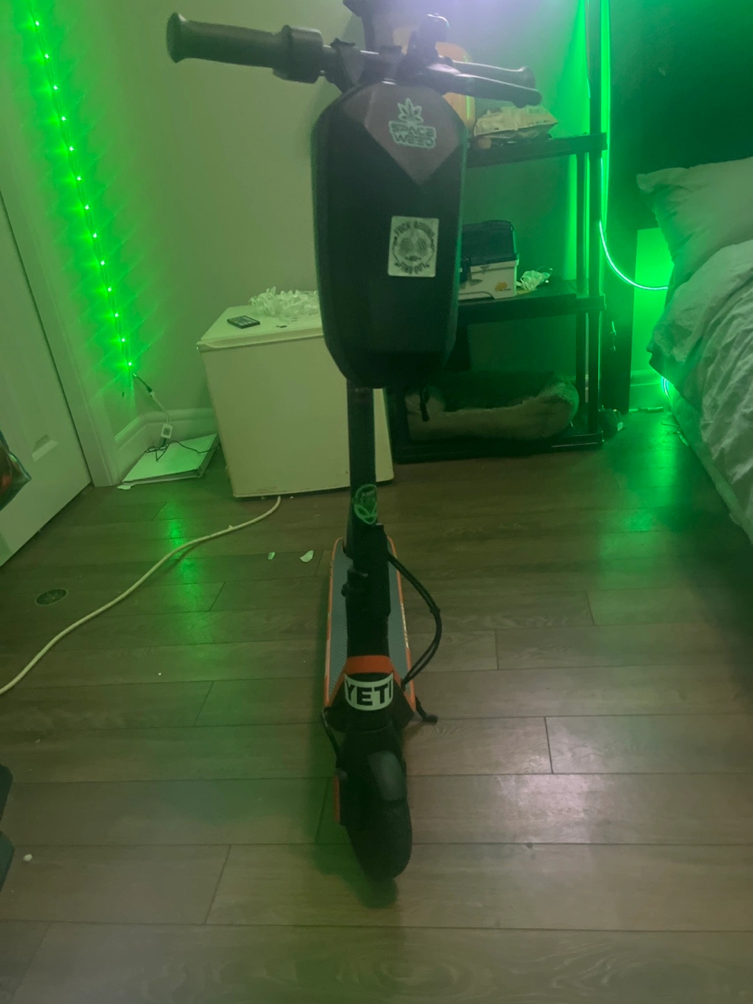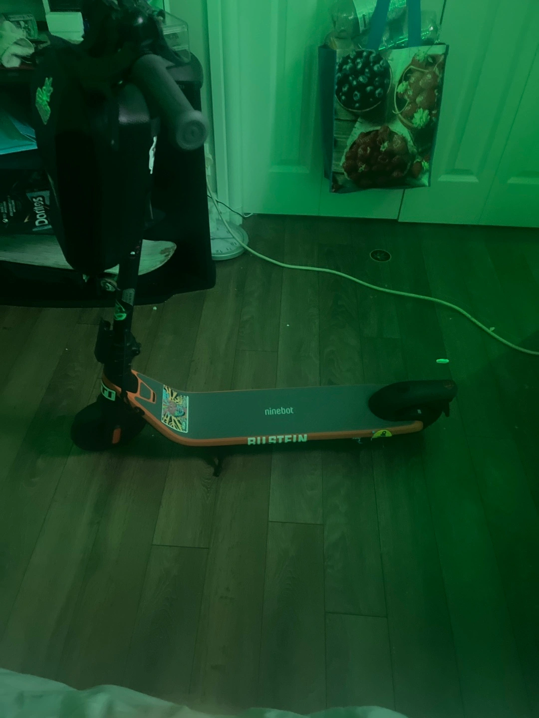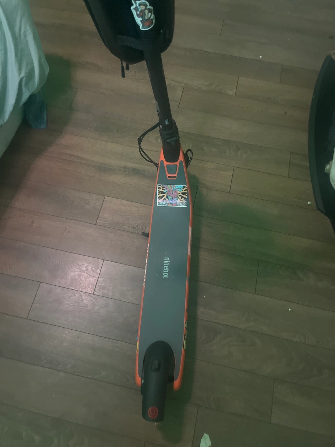 Electric scooter with a black frame and an orange deck. It has a bell and a black bag on the handlebars. The stickers and are no longer. on it. Looking to trade for a VR headset. Meta quest three or Meta quest two