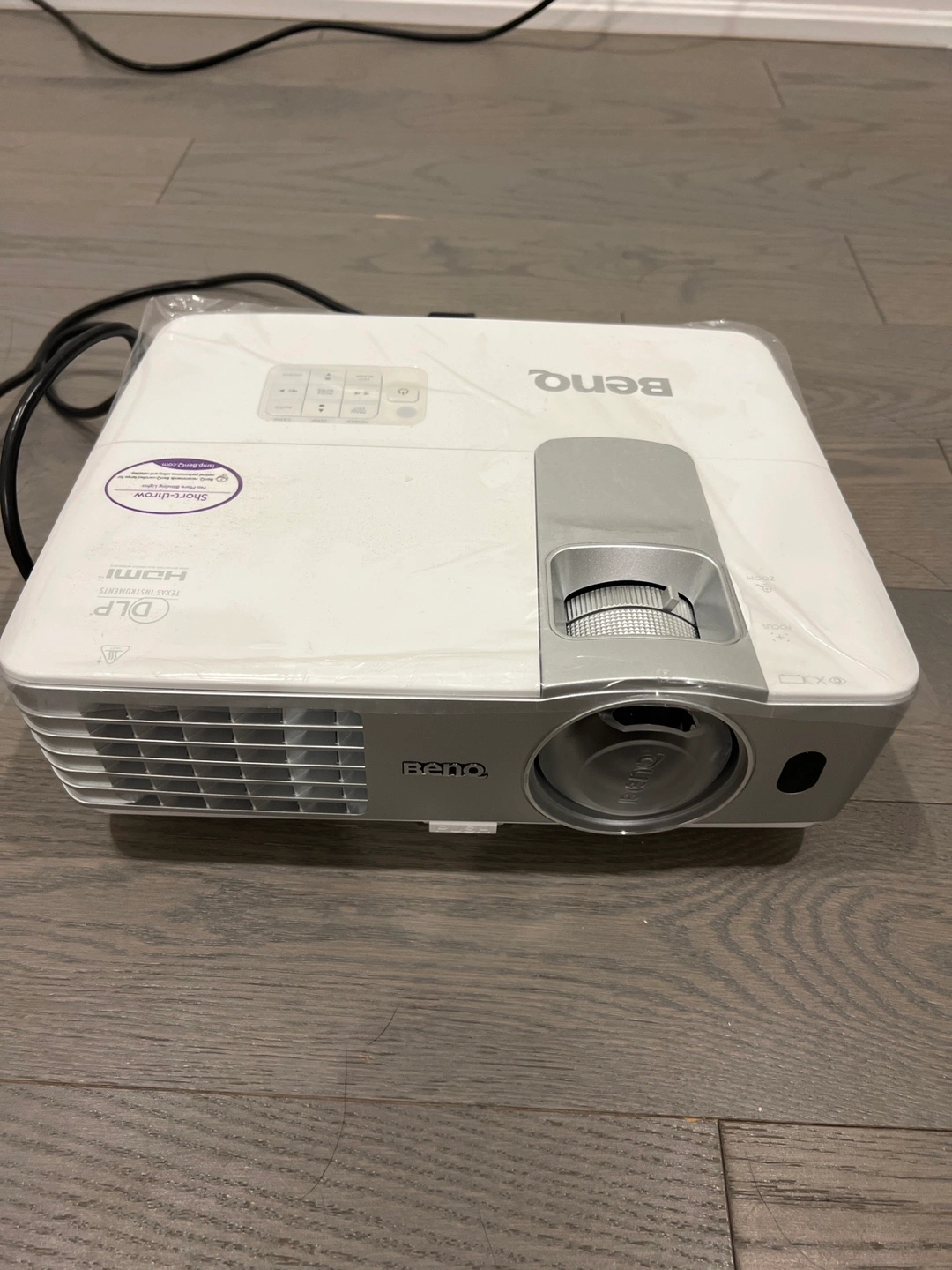 White projector with a silver lens, HDMI port, and control buttons on top.