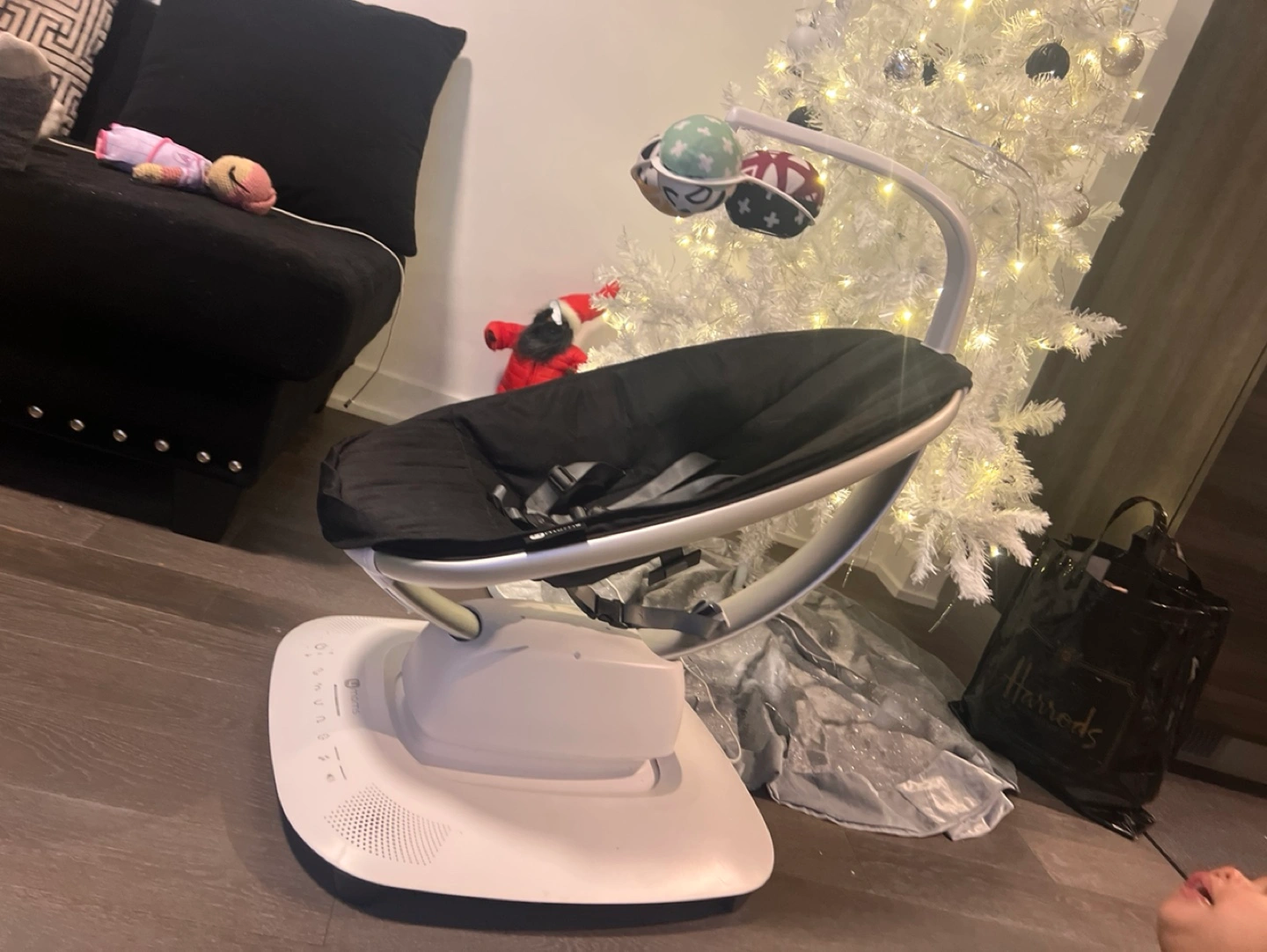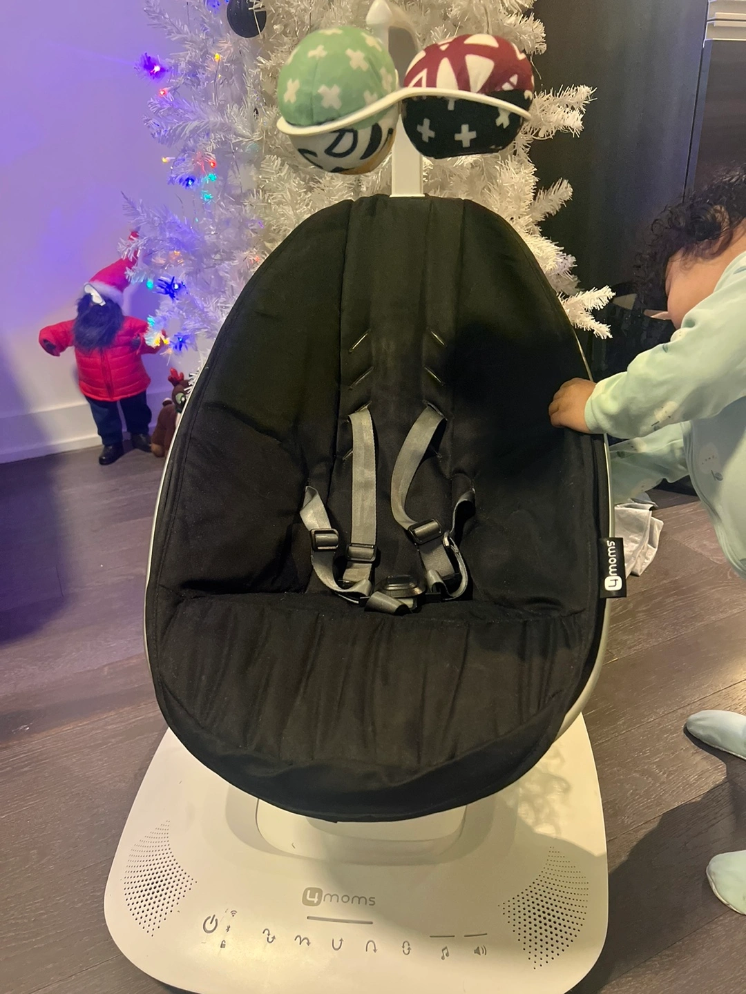 Black mamaRoo 4 baby swing. Comes with the mobile, which features various toys. in excellent condition. UP TO 25 pounds….. I can’t post the video of it swaying and the music. DO NOT REMEMBER HOW TO DISASSEMBLE SO HAVE TO TAKE IN ONE PIECE