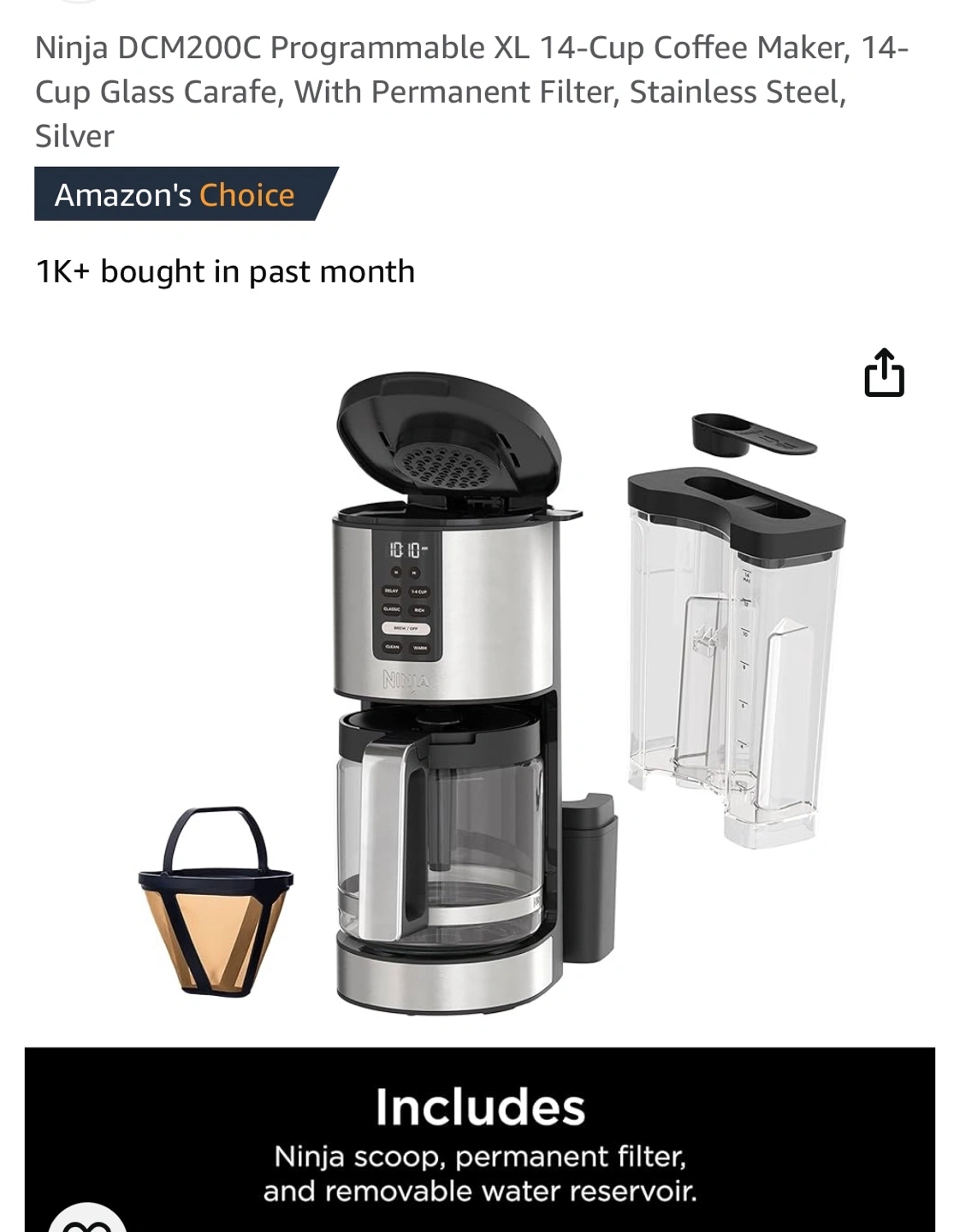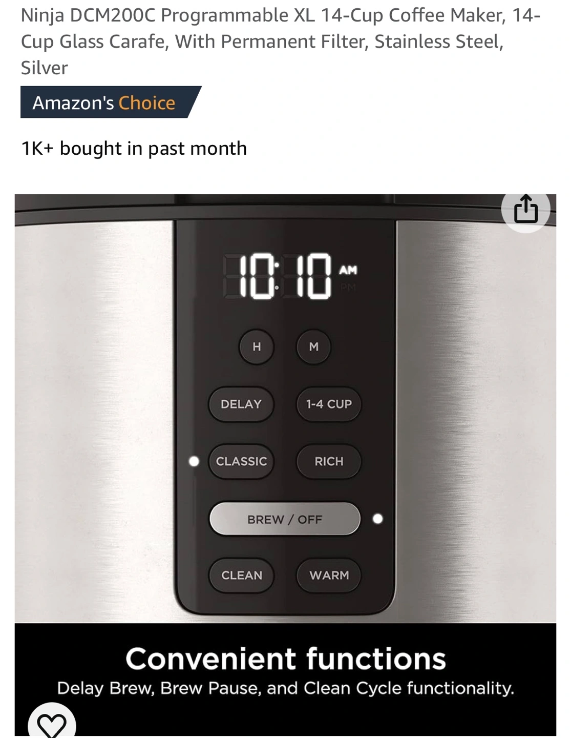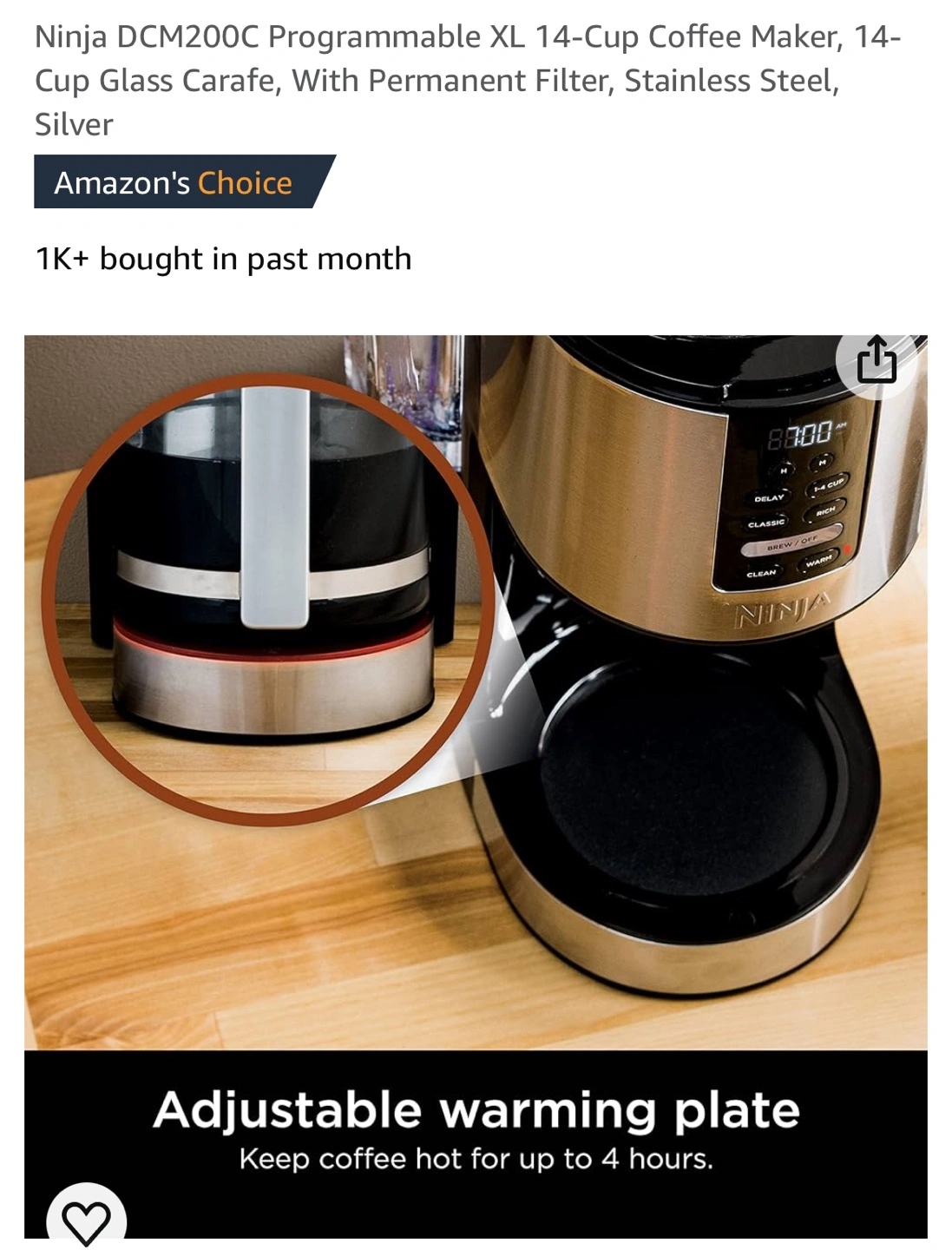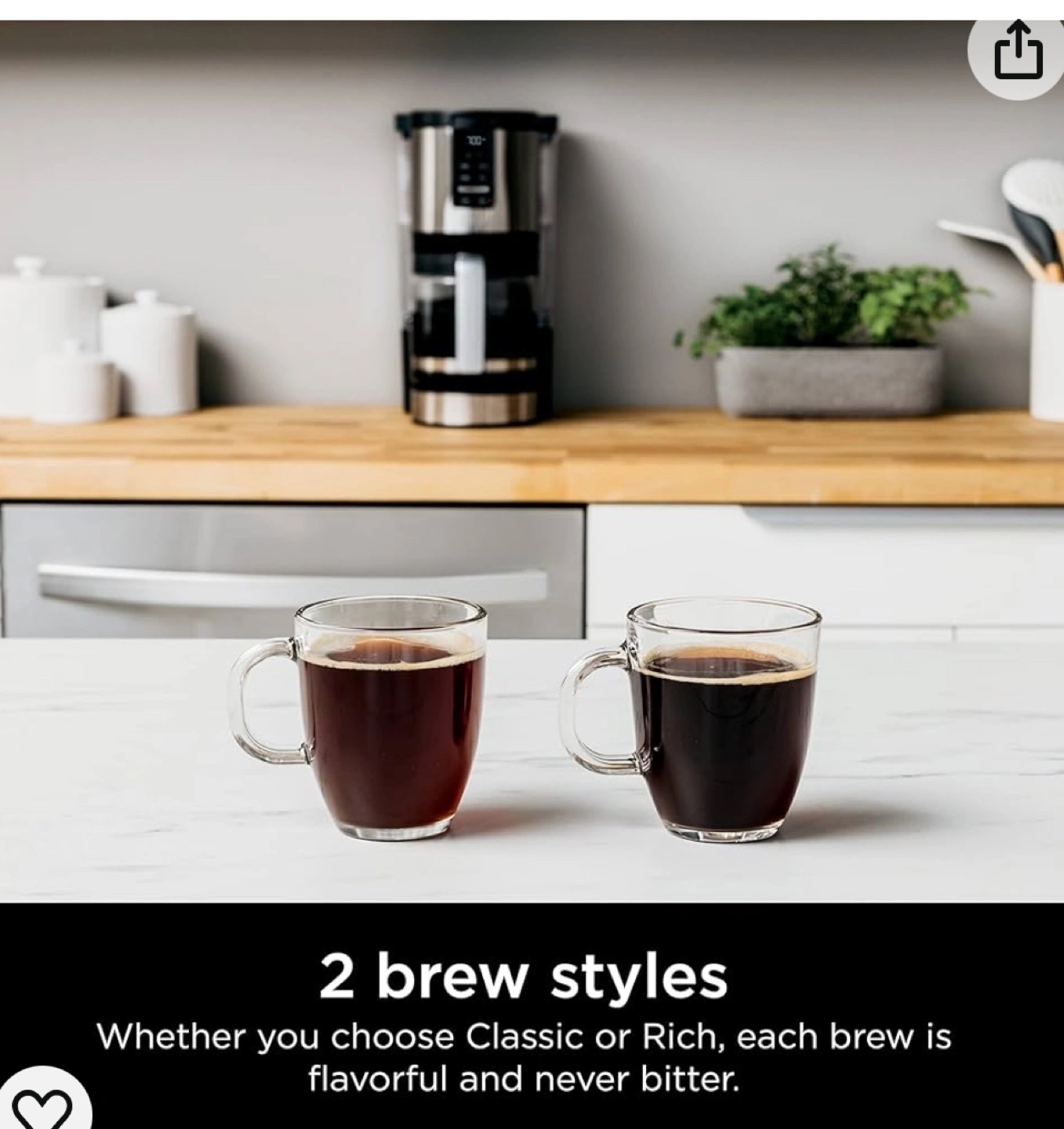 14514-cup coffee maker with a glass carafe. Features a permanent filter, stainless steel design, and adjustable warming plate. Includes two brew styles, classic or rich.