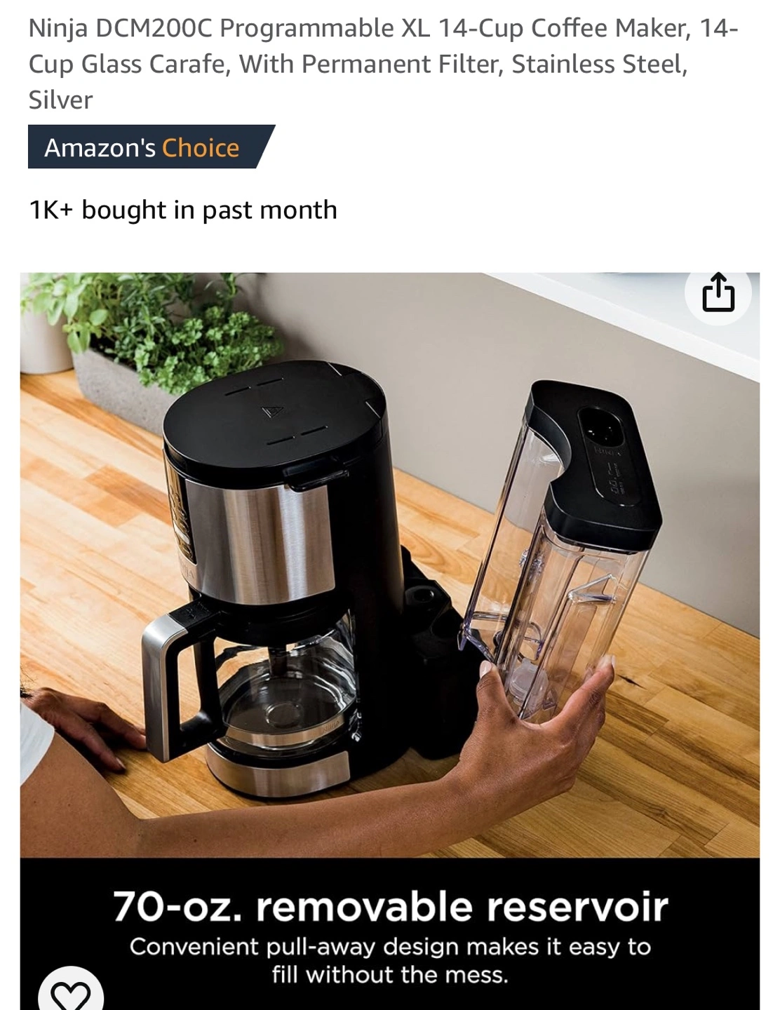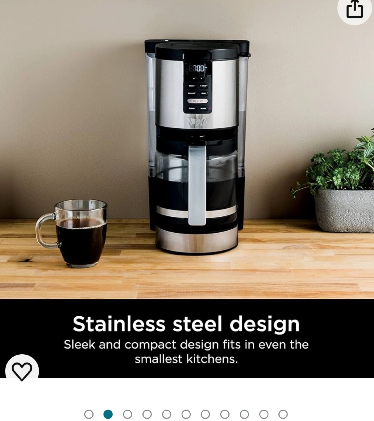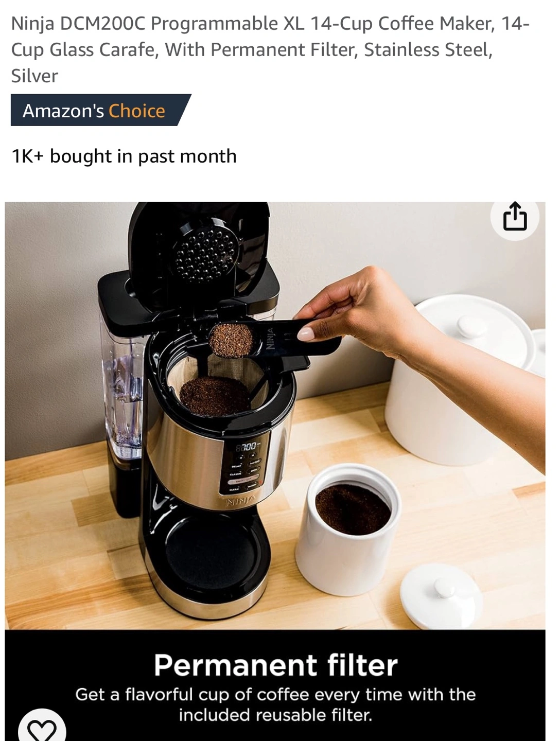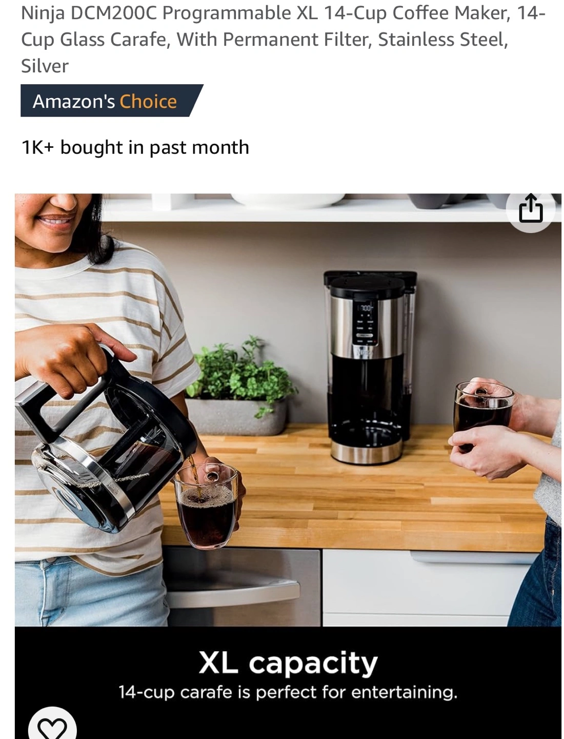 14514-cup coffee maker with a glass carafe. Features a permanent filter, stainless steel design, and adjustable warming plate. Includes two brew styles, classic or rich.