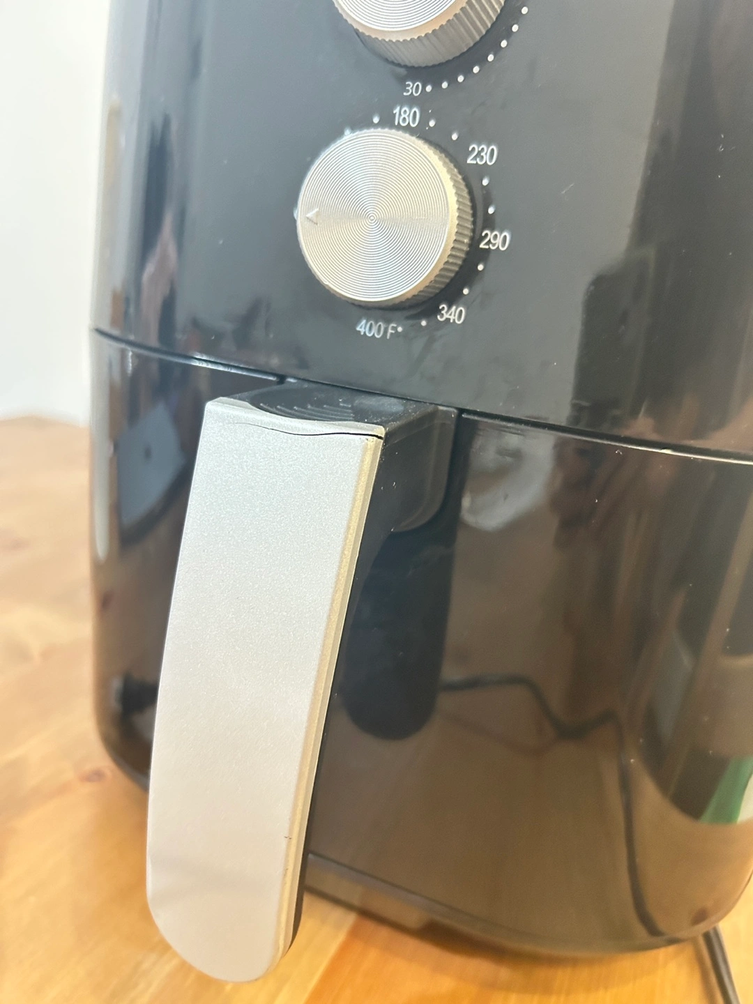 Air fryer with a black exterior and silver accents.