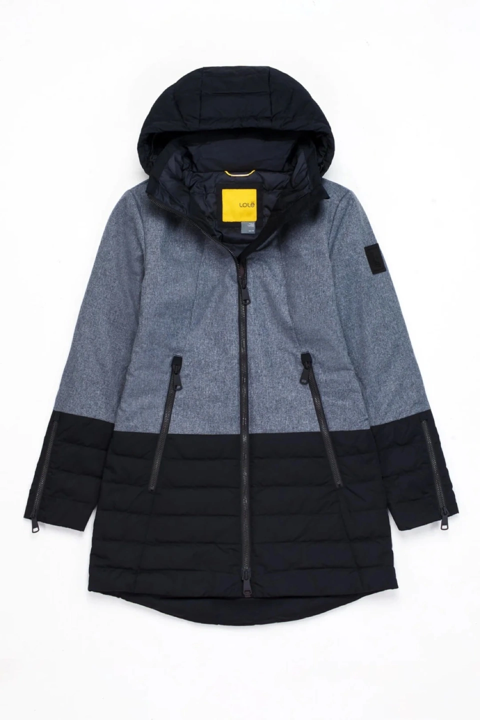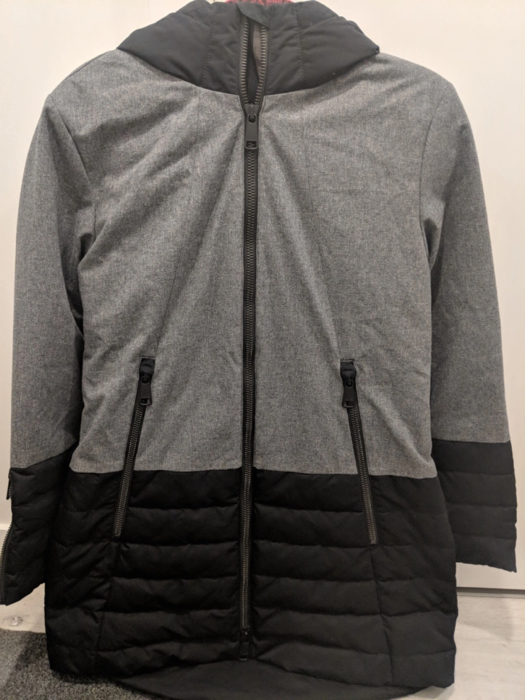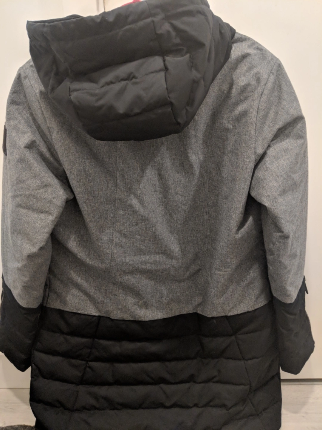 Grey and black winter jacket with a hood, quilted lower half. Got this jacket last year but never wore it, has been hanging in my closet ever since