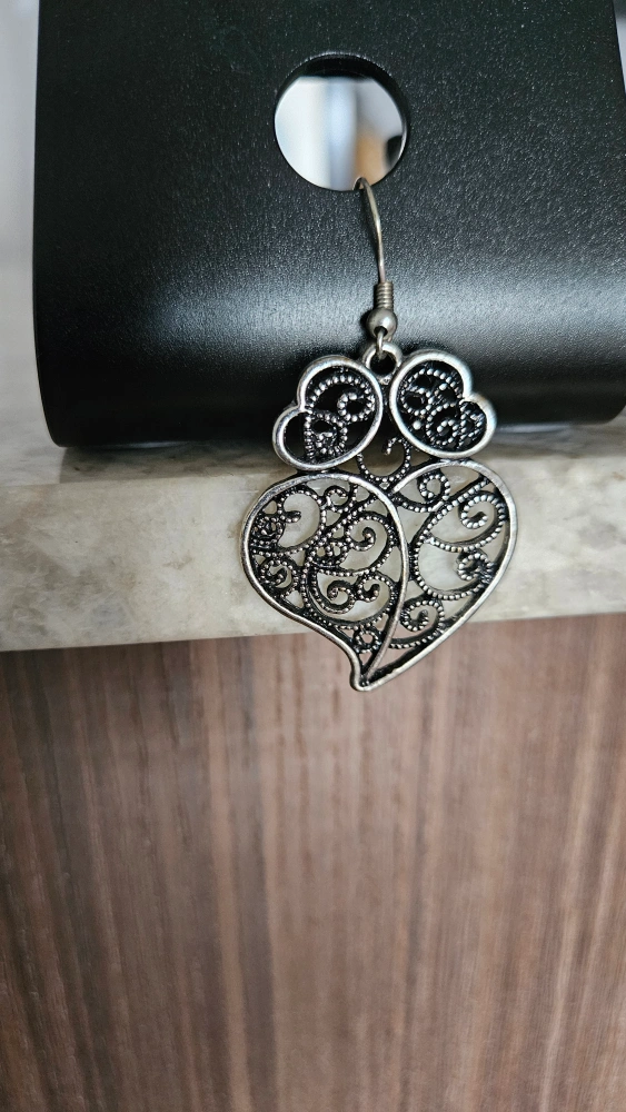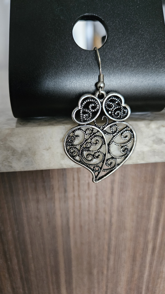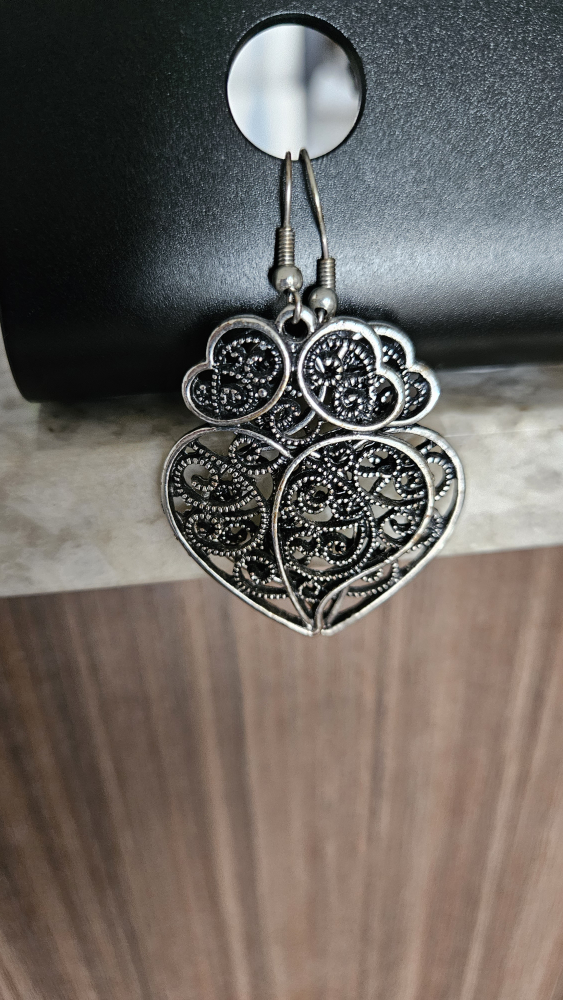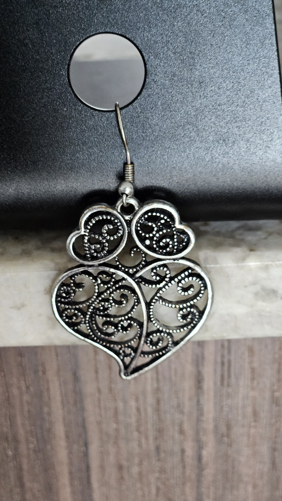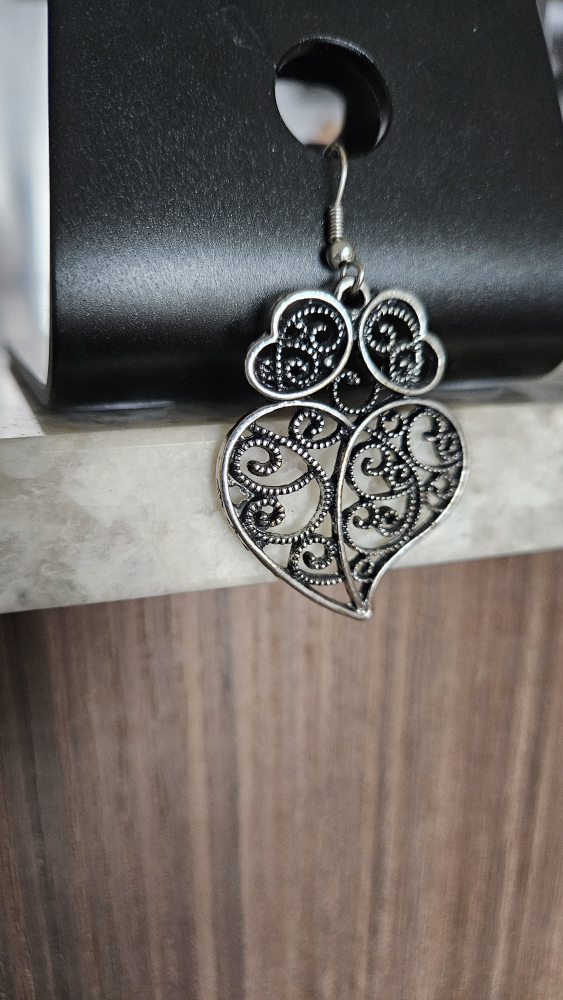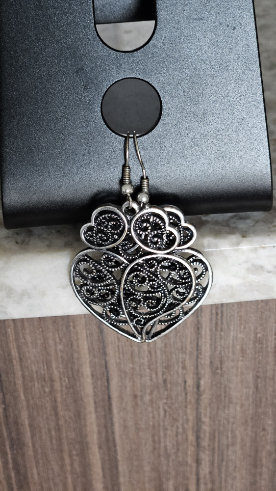 Beautiful dark silver filigree heart dangle earrings. Perfect for any occasion.