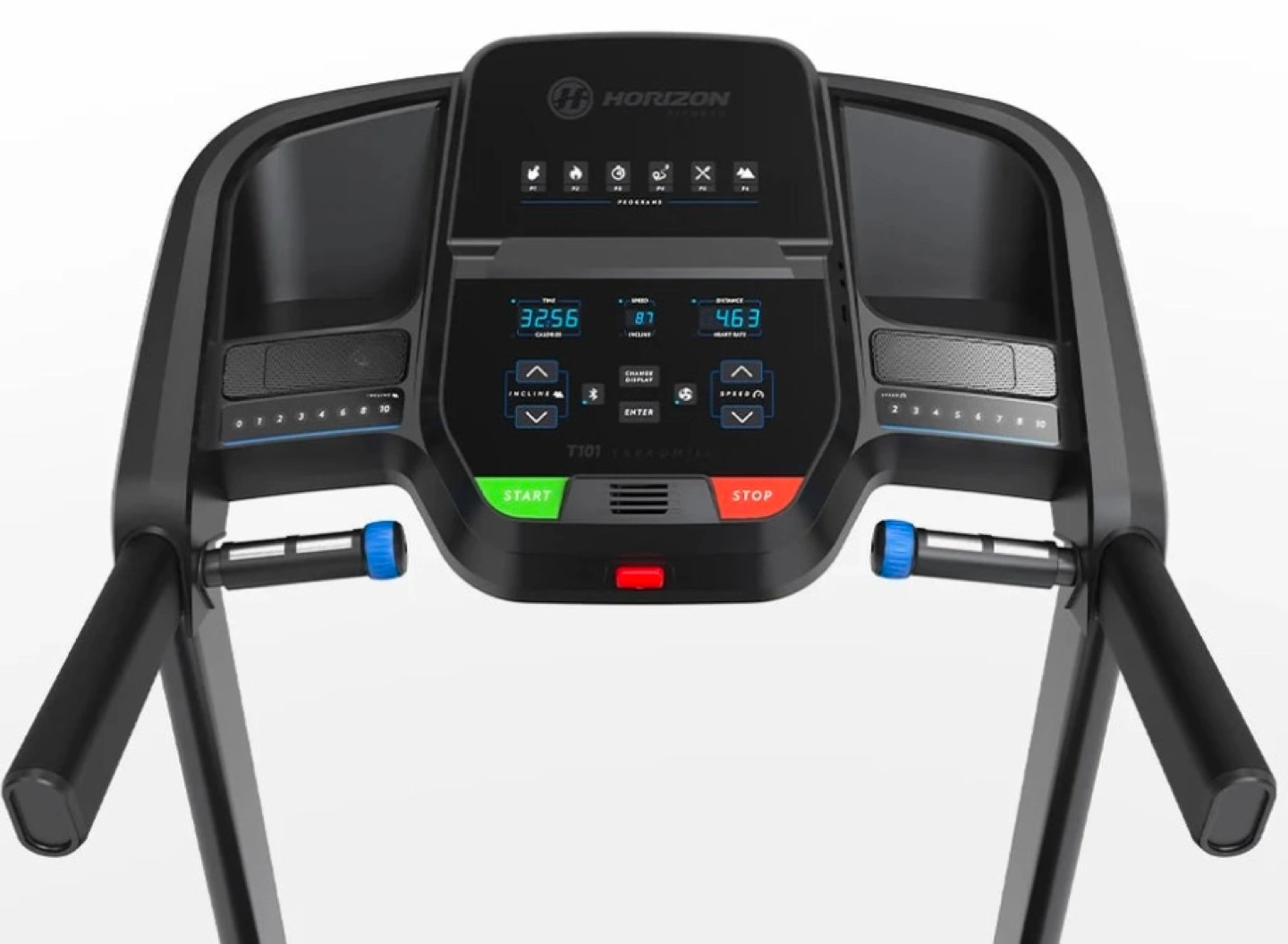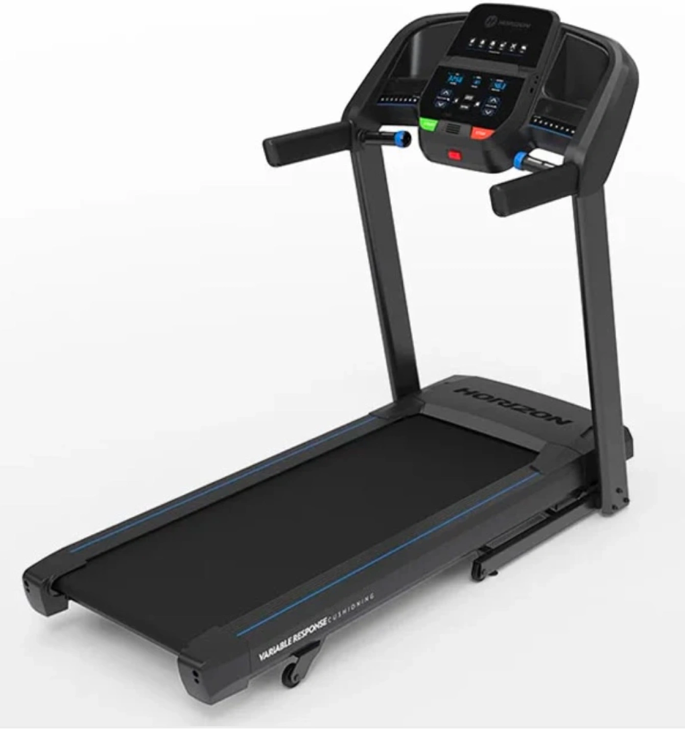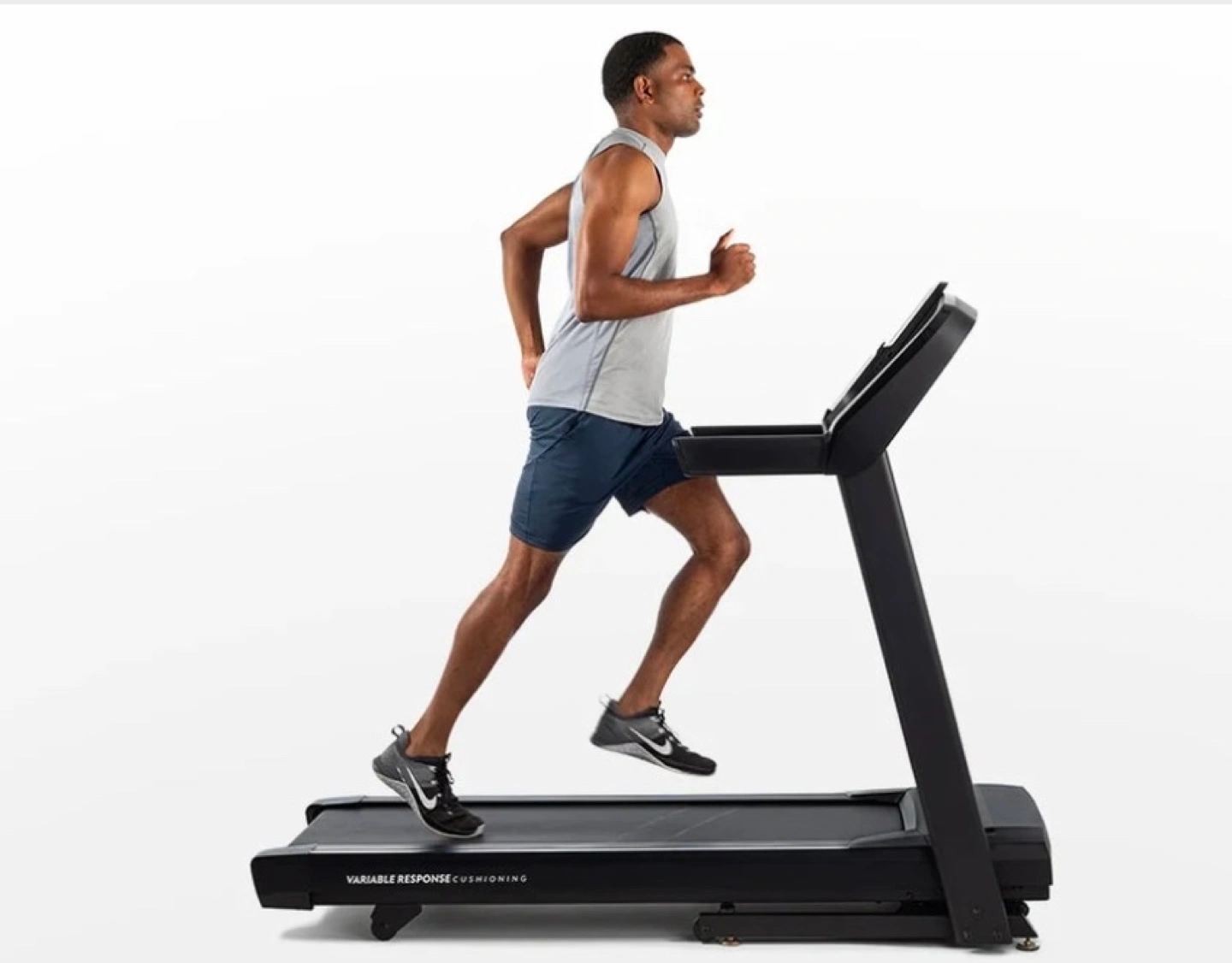 34Treadmill with a digital display and variable response cushioning. Includes handrails with integrated controls.