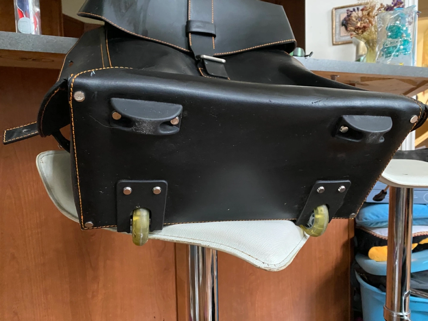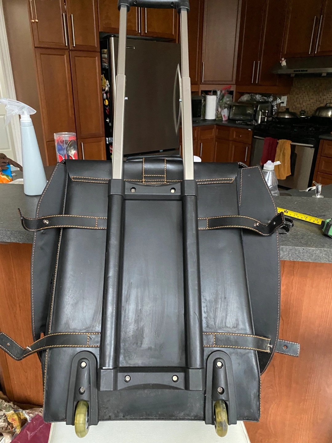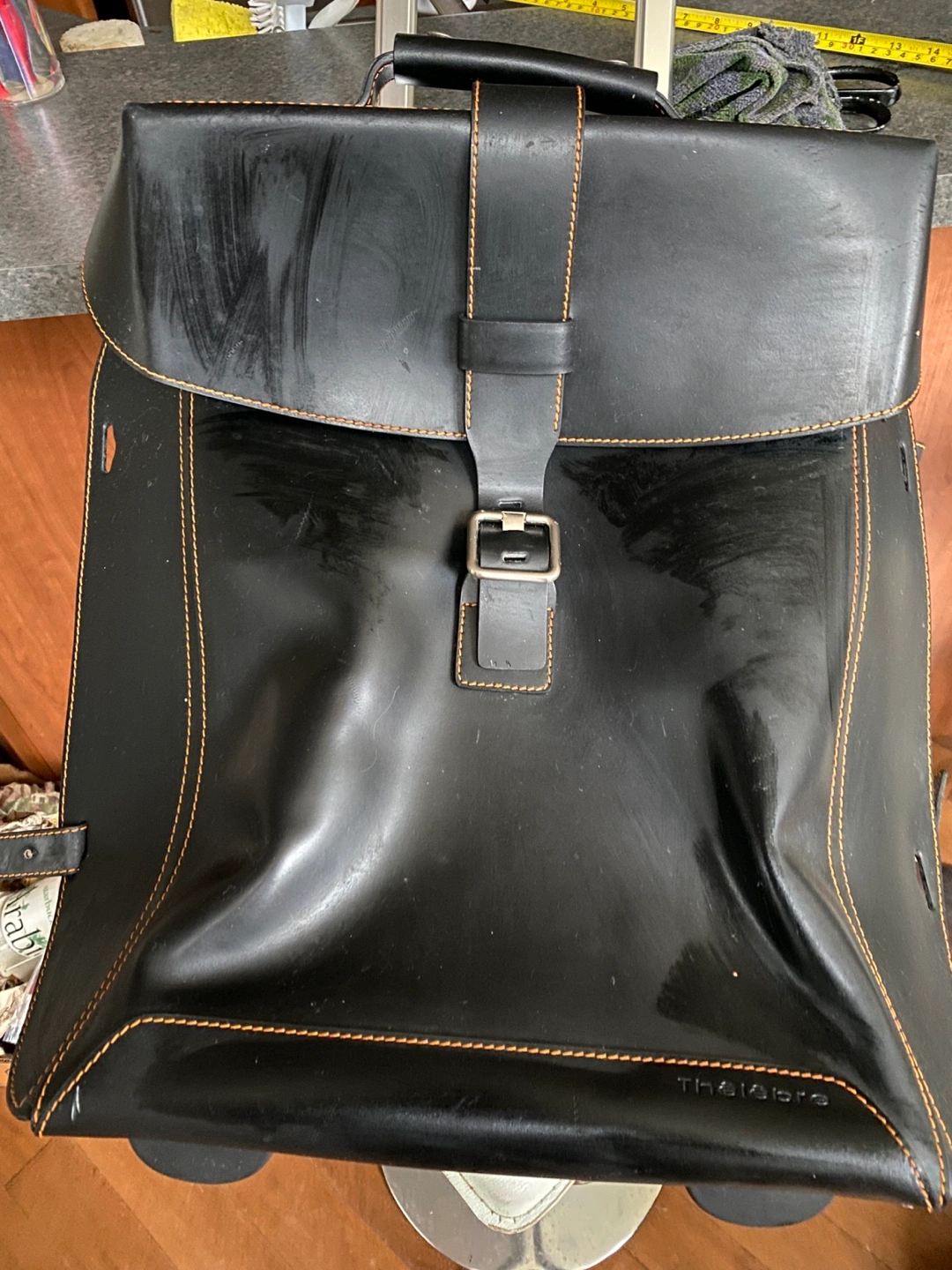 Black leather rolling backpack. Has two large compartments, one with a smaller pocket, and a smaller external pocket. Has a retractable handle and four wheels. Size 45x35x13 cm