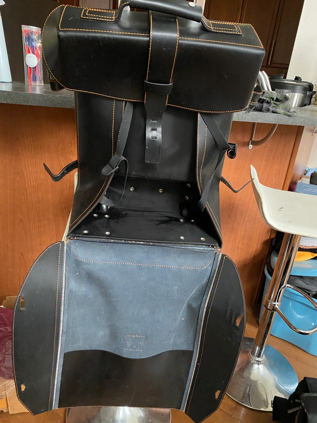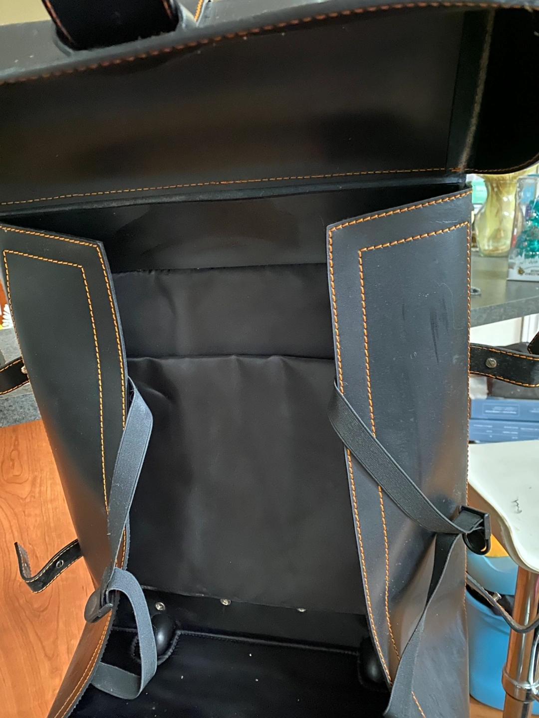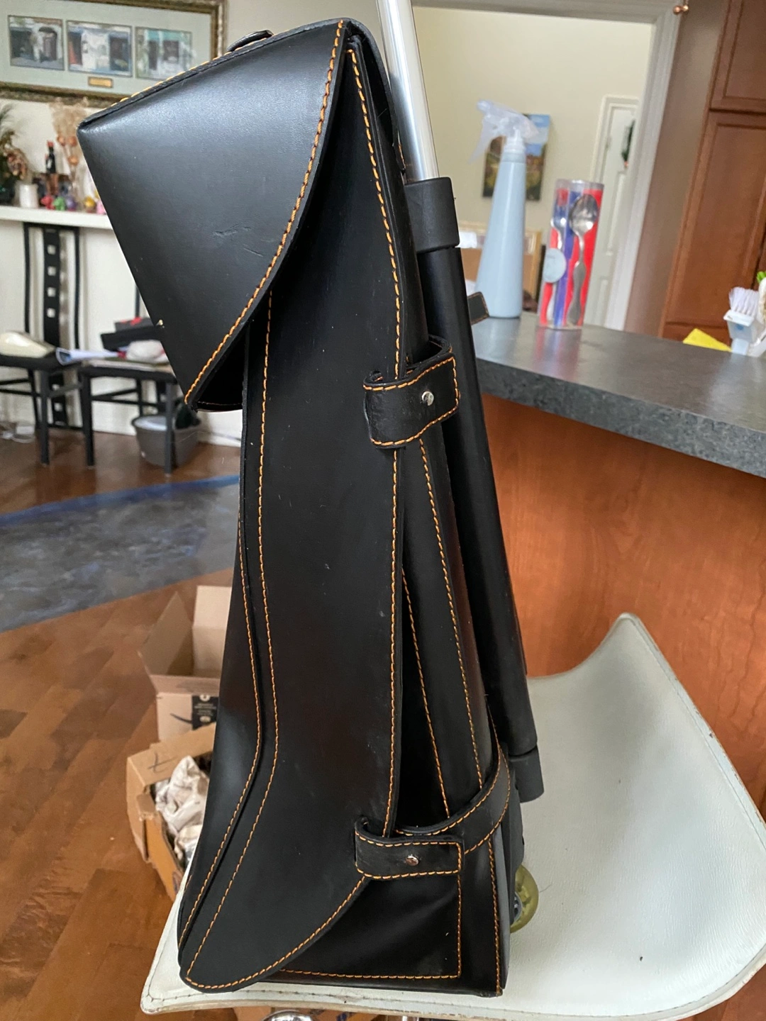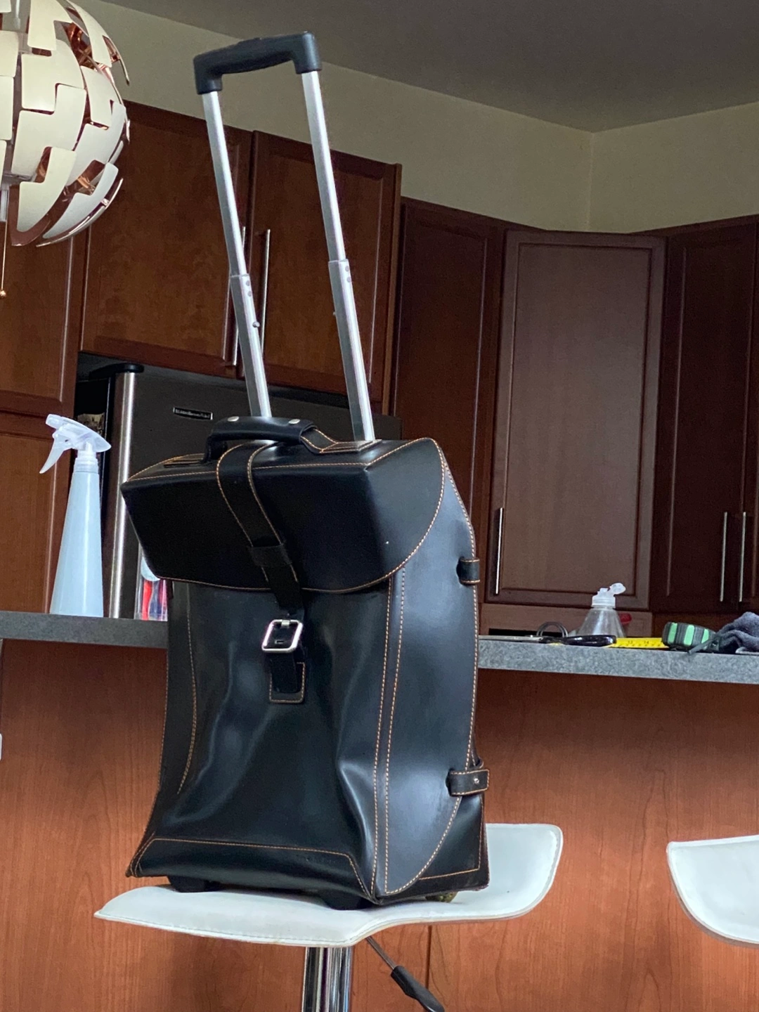 Black leather rolling backpack. Has two large compartments, one with a smaller pocket, and a smaller external pocket. Has a retractable handle and four wheels. Size 45x35x13 cm