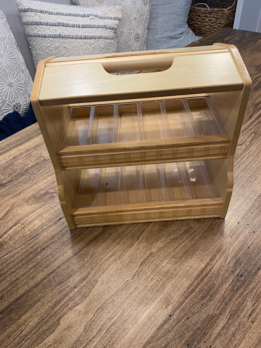 Wooden storage organizer with two levels and a carrying handle. Features Thomas the Tank Engine on the front. Ideal for storing small toys, arts and crafts, or other items.