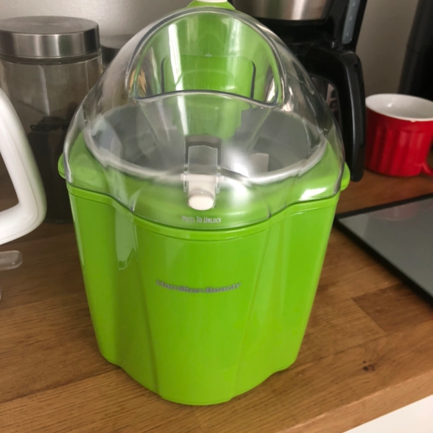 Green Cuisinart ice cream maker. Used, but in good condition (some light scratches). Size: 10” height by 9”
