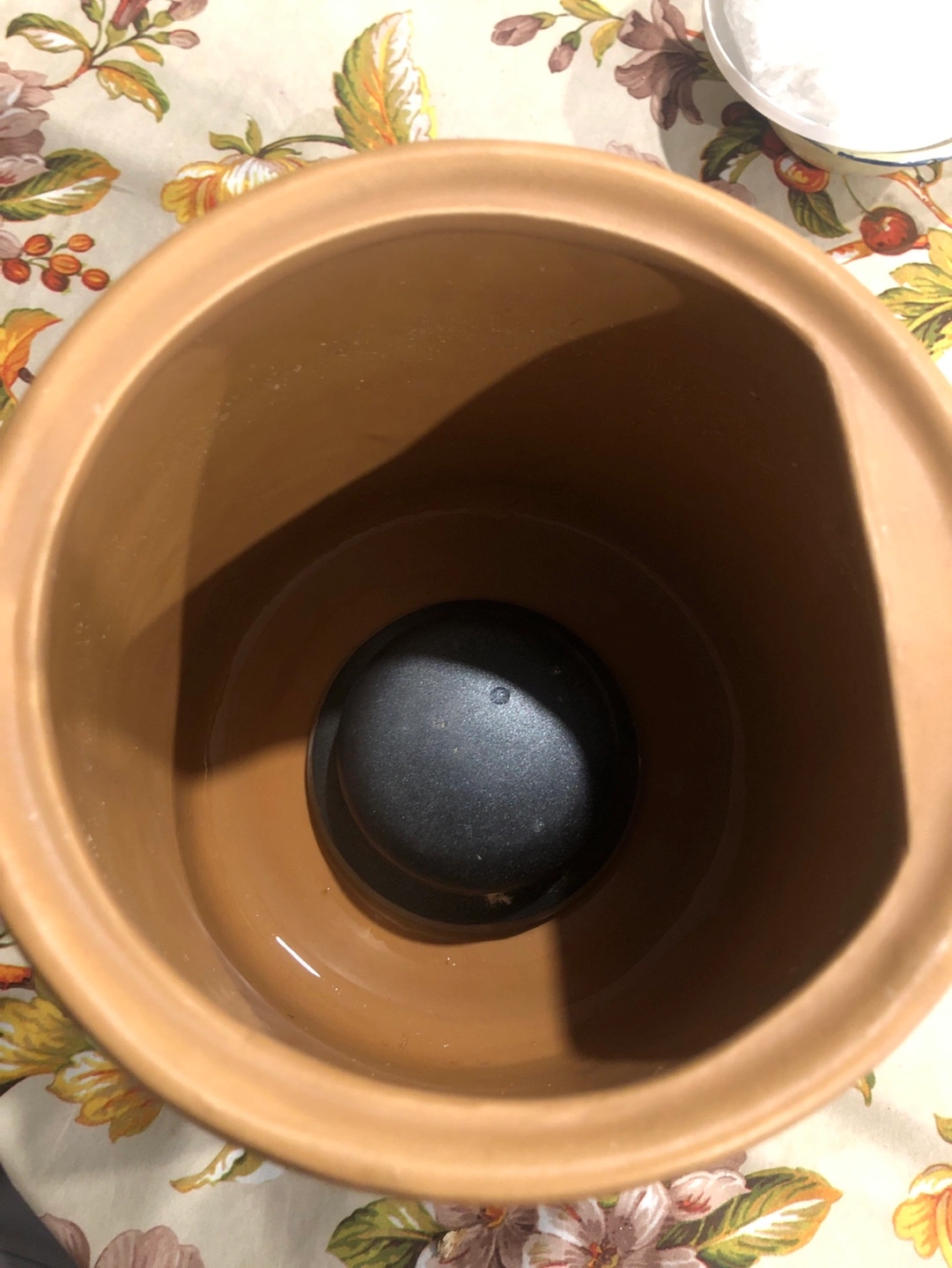 Chinese medicine herbal clay pot with a brown ceramic exterior. It has a handle and a lid. The pot has a power cord
