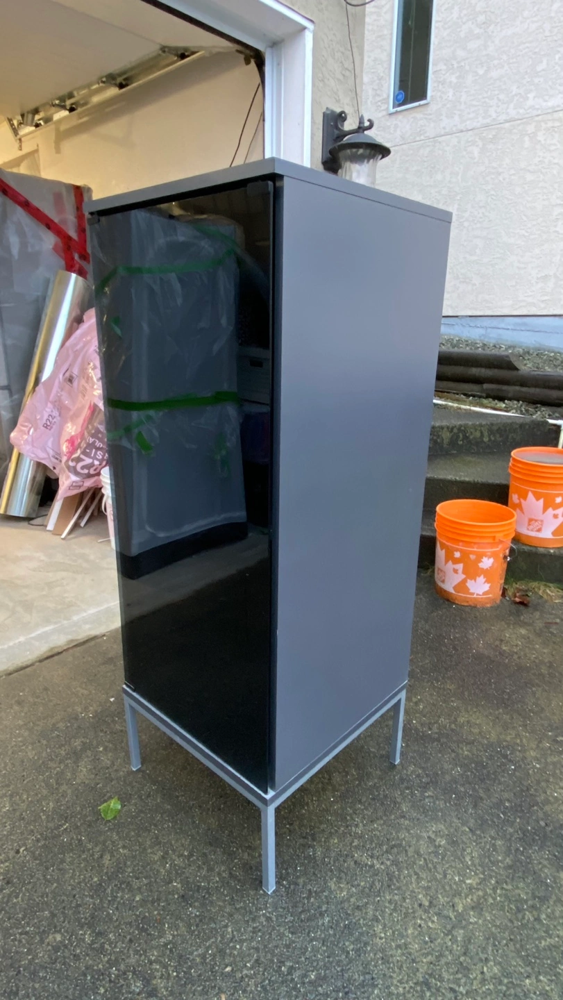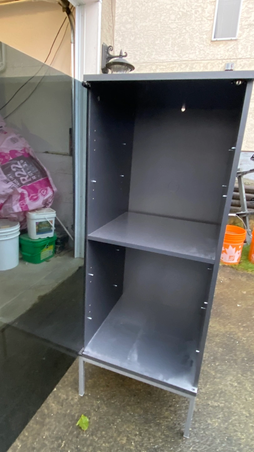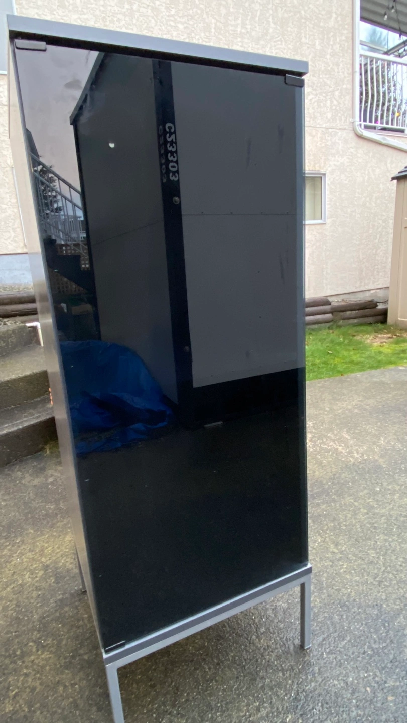 Black glass cabinet with five shelves (other 4 shelves are in storage). It has a glass door. The cabinet is in good condition. Great for storing books, CDs, DVD, or your special items.