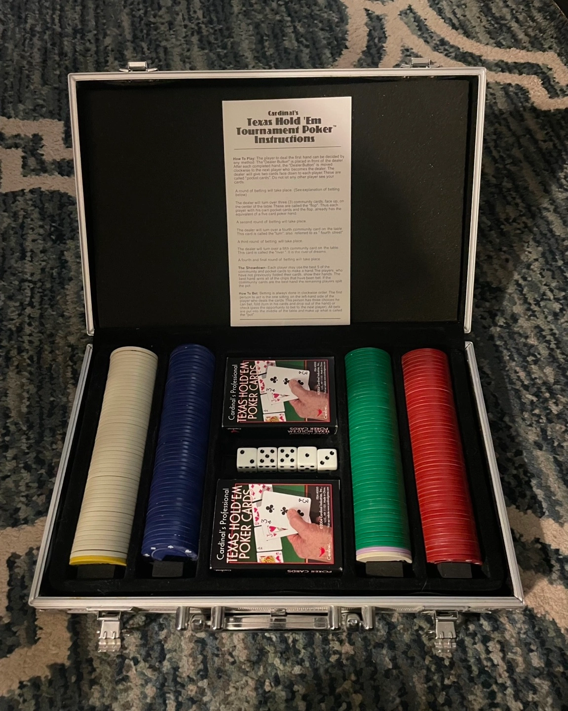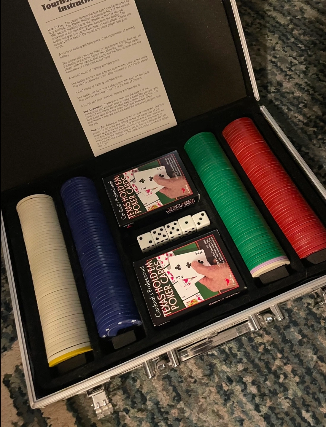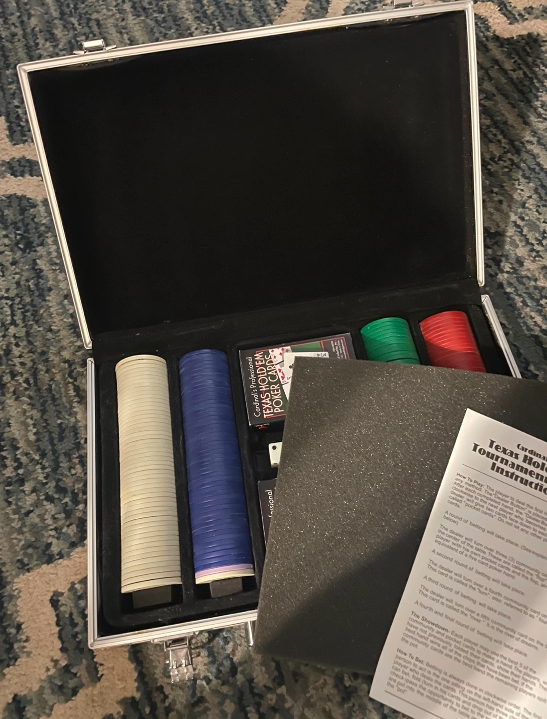 711Complete set, brand new.. never used - no longer have the cardboard overwrap. Could be gifted if you don’t mind that detail. Set includes: professional weight player chips, dealer, little blind, big blind, dice instructions and two decks of cards in a metal briefcase. Pick up from a smoke free home near Browns Line & Lakeshore in Etobicoke (Toronto/Mississauga).