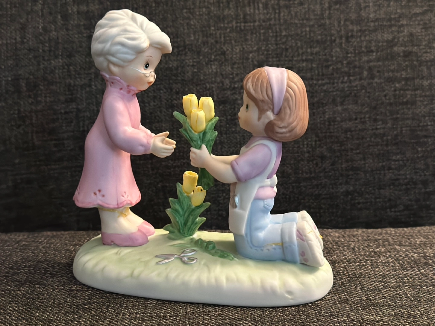 Porcelain figurine of two girls, one giving the other yellow flowers. The figurine is oval shaped and sits on a green base. The base includes a pair of silver scissors.