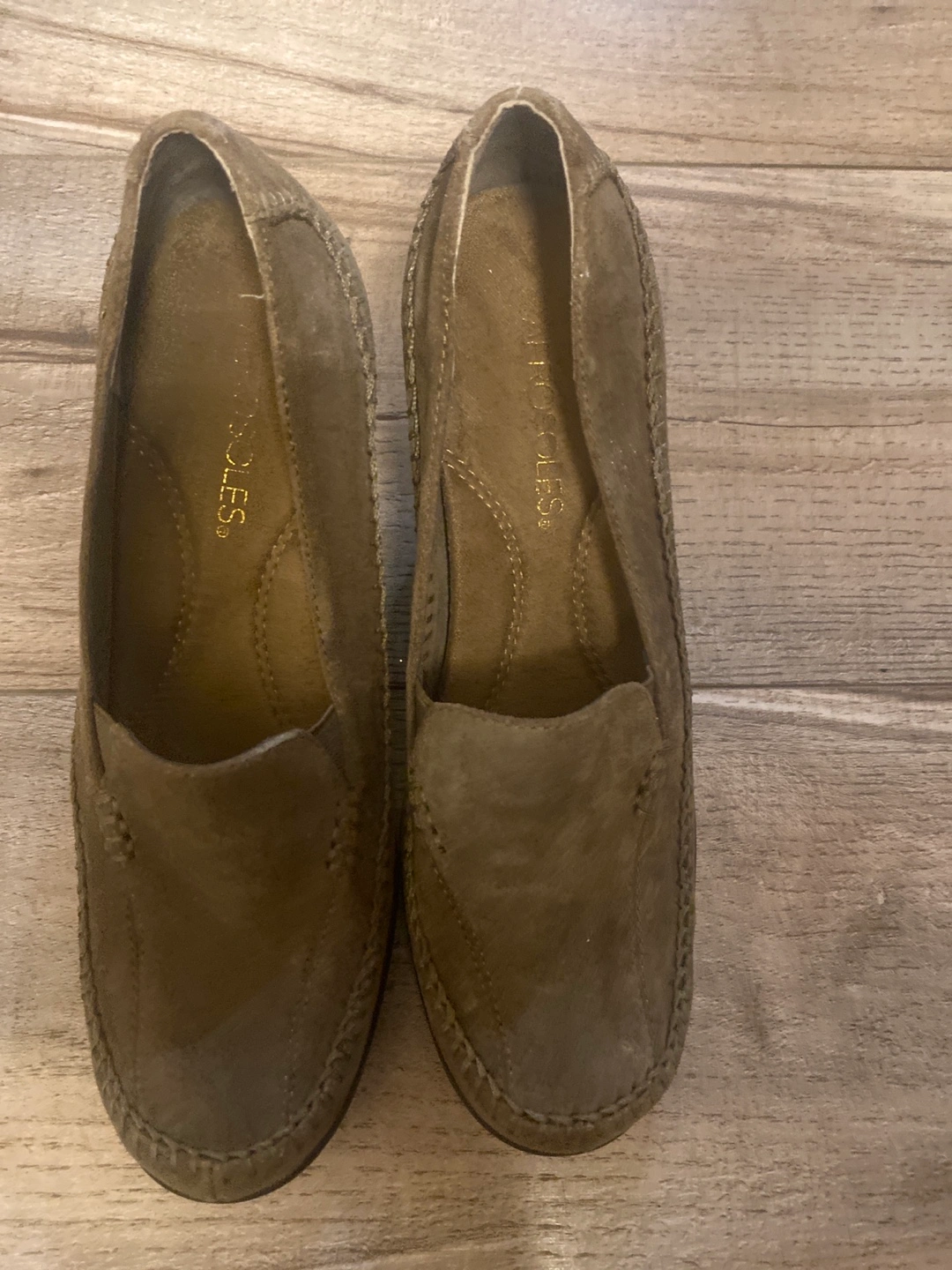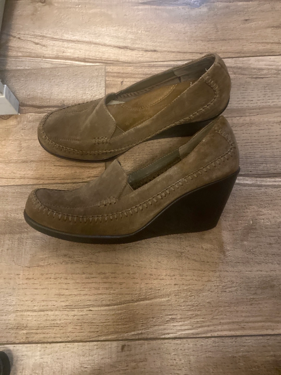 Suede wedge shoes with a brown/olive color. Comfortable for walking and casual occasions.
