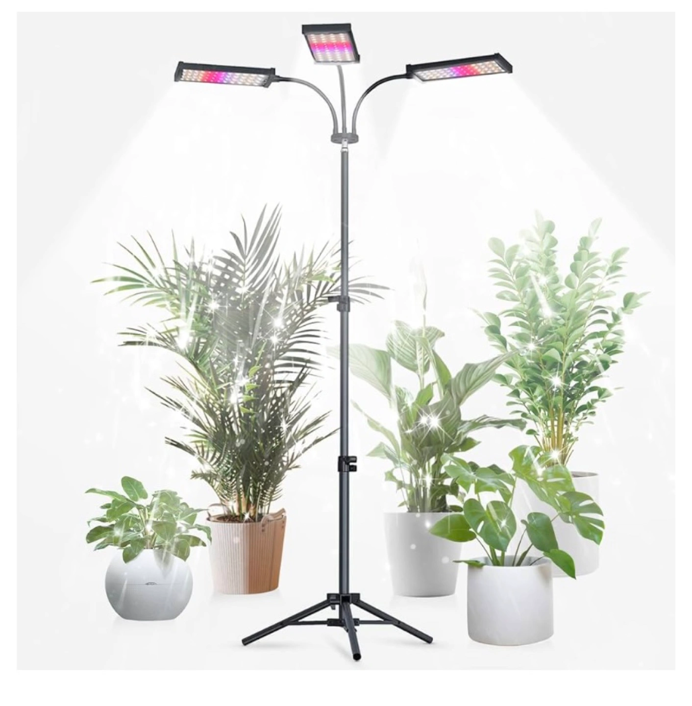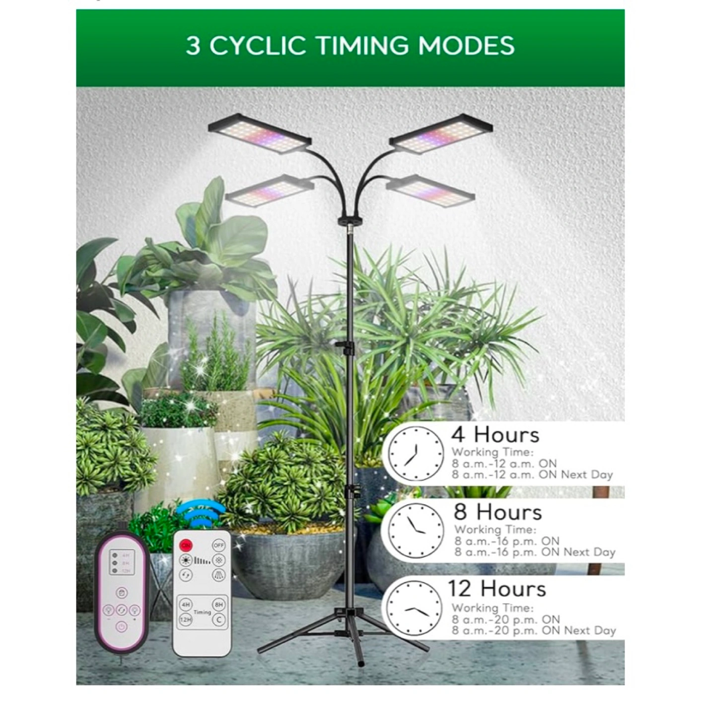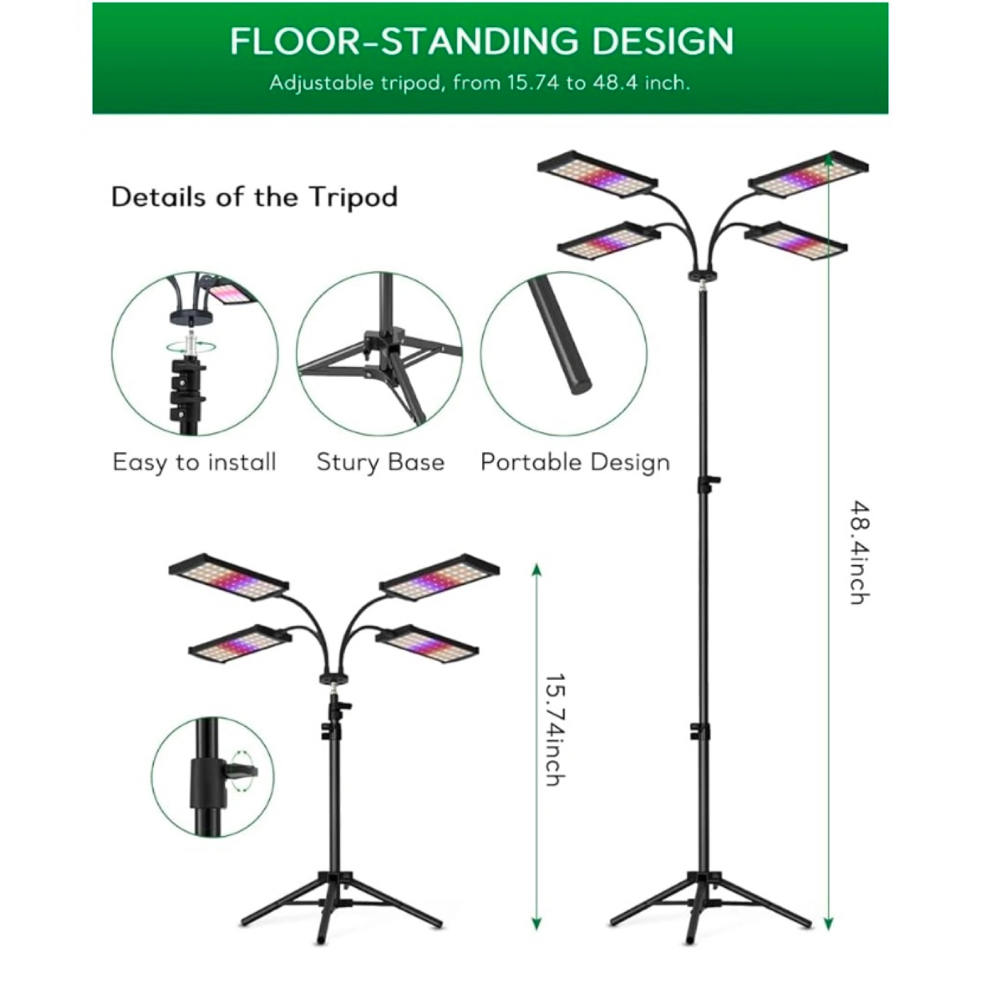 3 light heads with adjustable height and dimming levels. Includes remote control. Floor-standing with adjustable tripod.