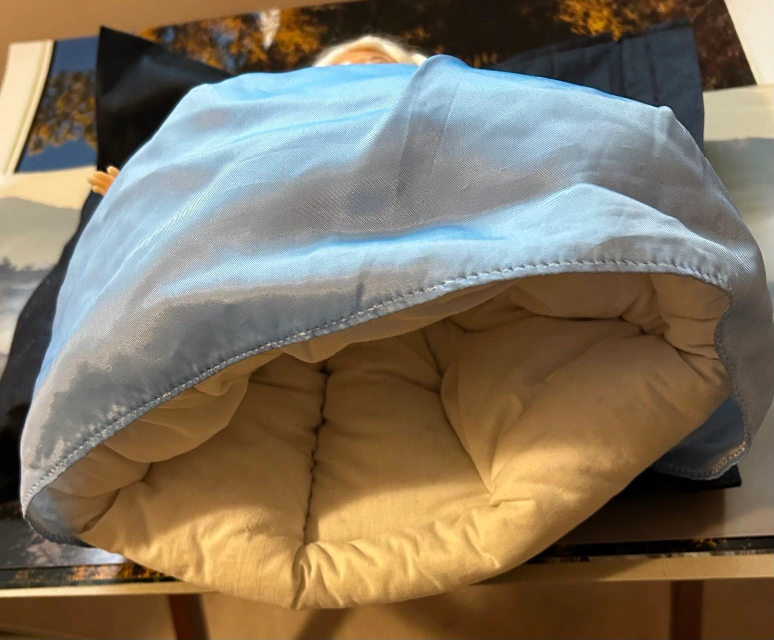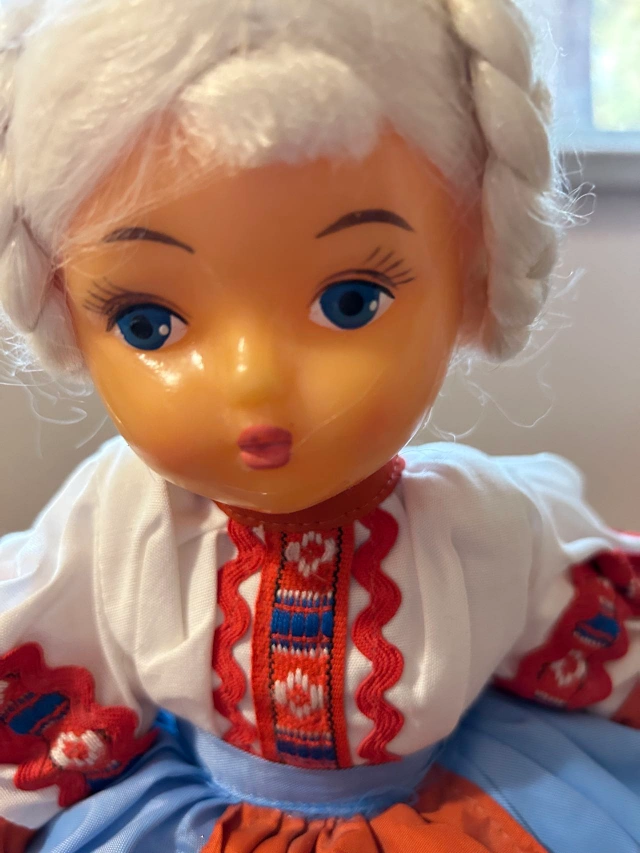 Vintage Russian doll with porcelain face . Dressed in a traditional folk costume in a blue dress and red and white accents. The doll is sitting in a blue fabric pouch, with a white padded lining, can be a tea pot warmer.