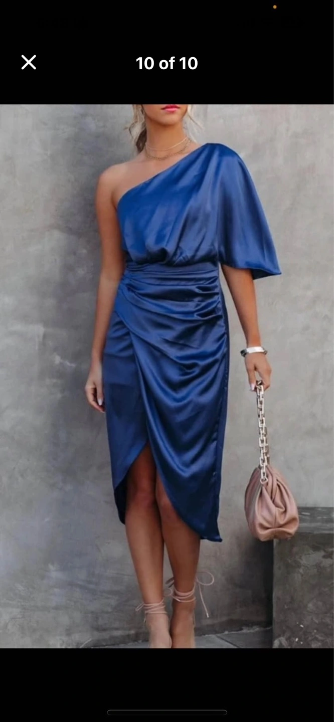 One shoulder midi dress, blue satin, ruched detail, short sleeve
