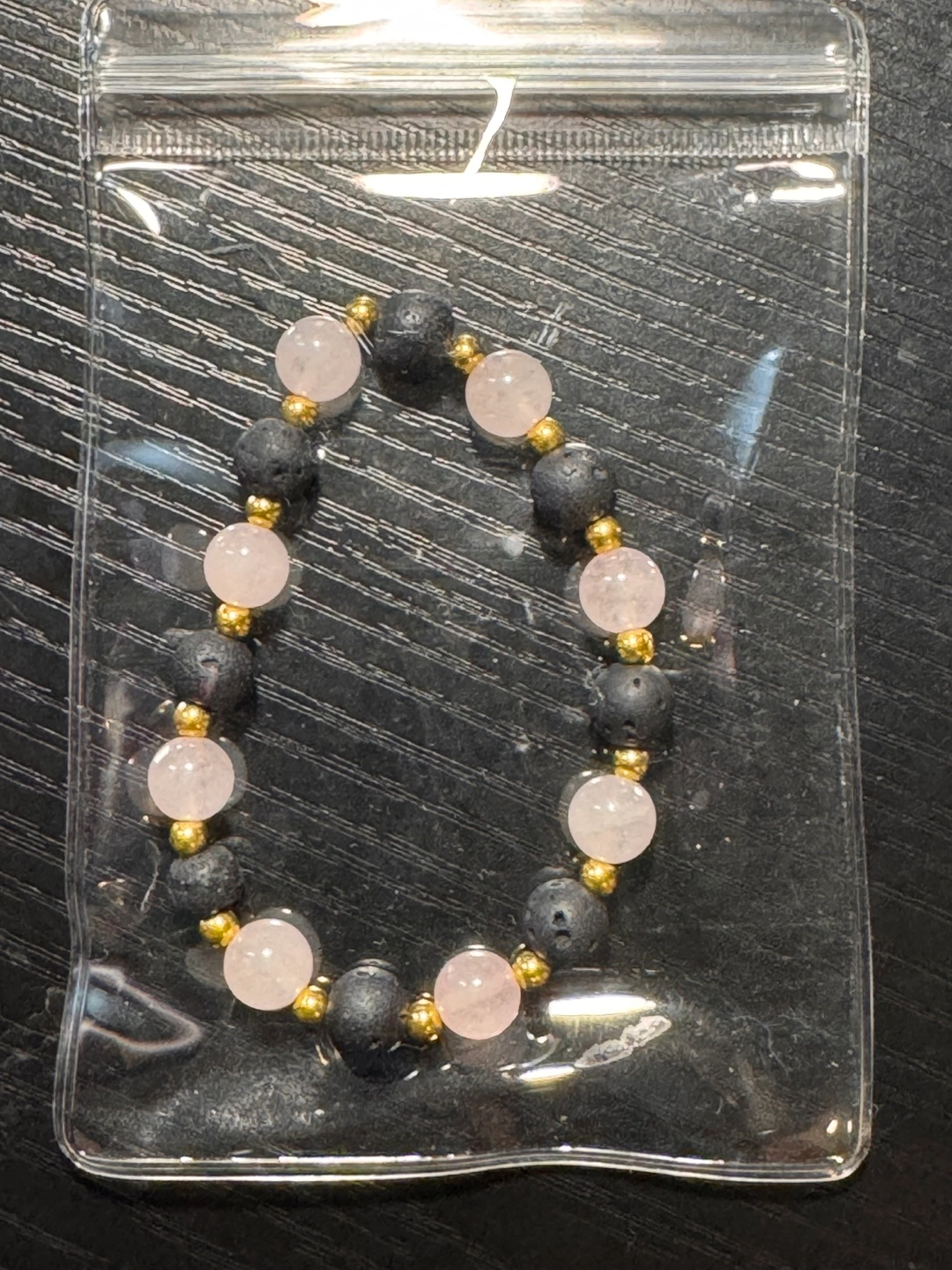 Set of four beaded bracelets. Three beaded bracelets with pearls and coloured beads. One bracelet with rose quartz and lava beads.