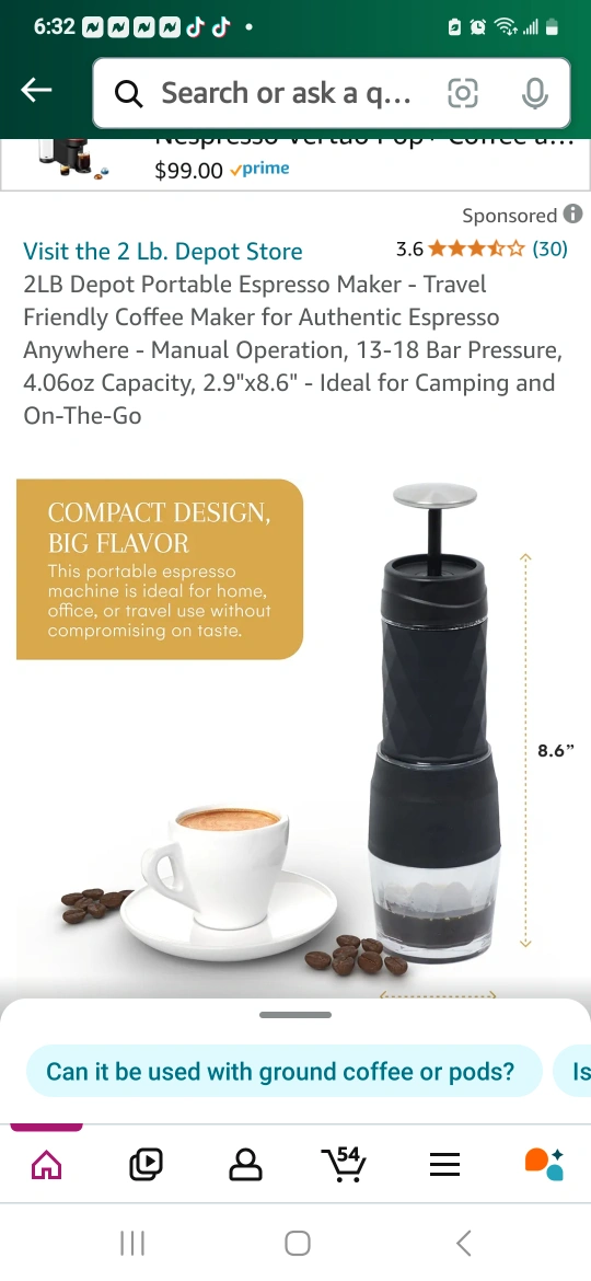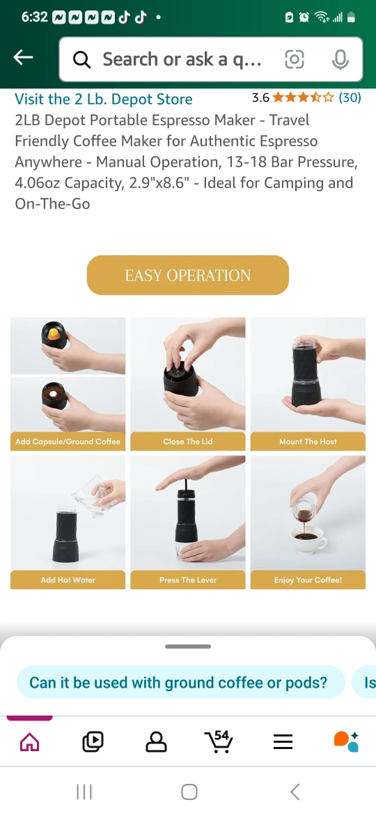 Manual operation, 13-18 bar pressure, 4.06oz capacity, 2.9"x8.6". Ideal for camping and on-the-go. Compact design, big flavor.