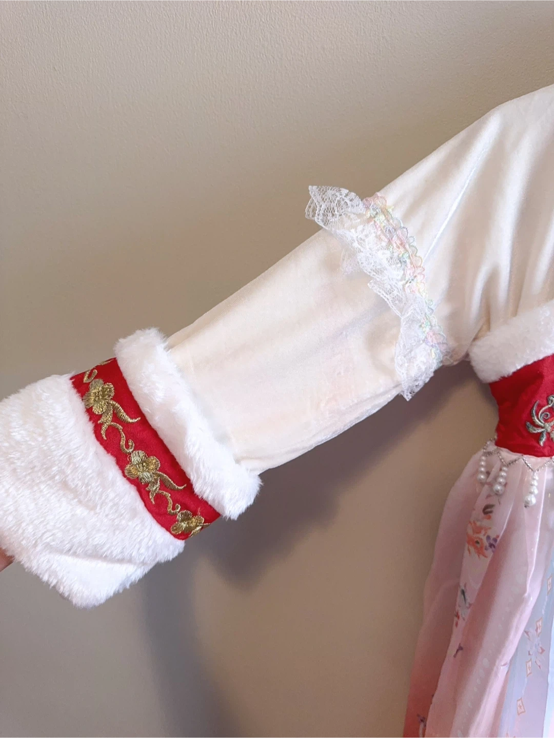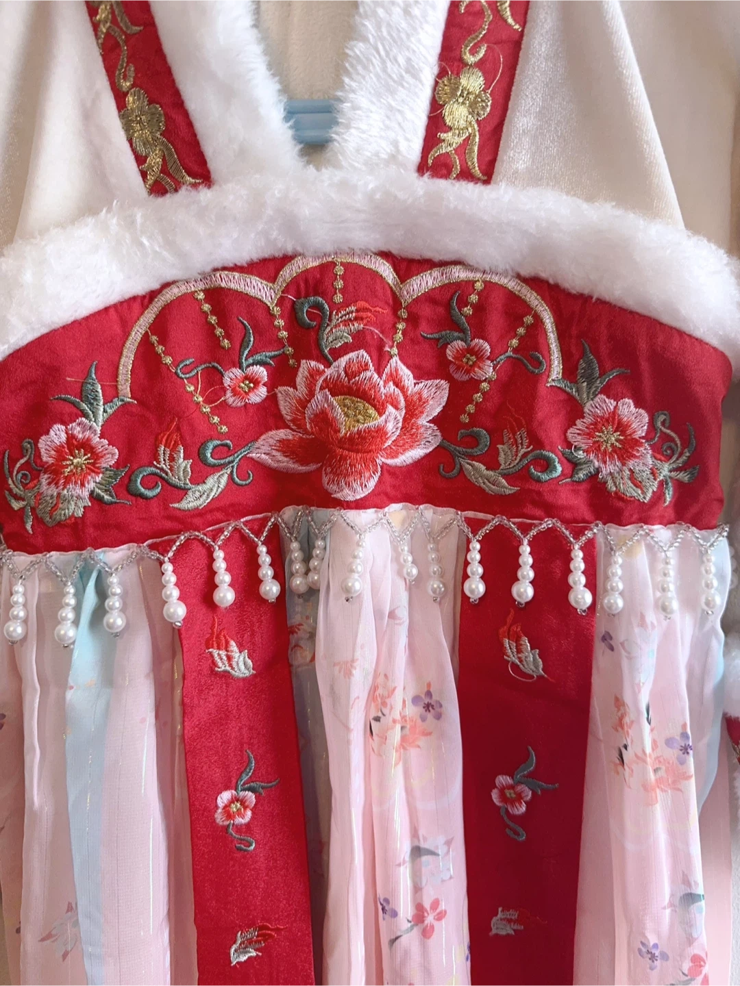 This adorable dress features a cream-coloured velvet-like fabric with white faux fur trim. It's beautifully embellished with red satin ribbon, gold embroidery, and delicate pearl accents. The skirt has a flowy, multi-layered design in shades of pink and white with floral and butterfly prints. It fastens with a red sash at the back. Perfect for cultural events or festive occasions!