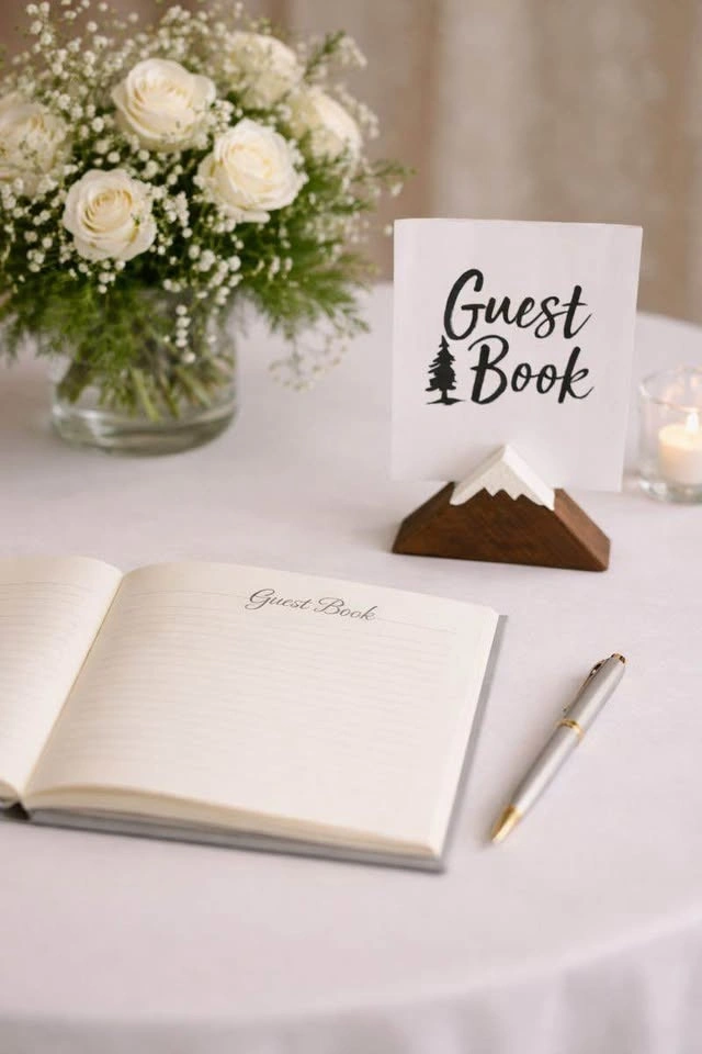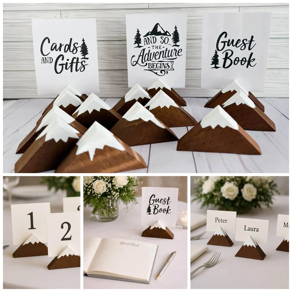 3 wooden mountain card holders with matching signs: "And so the Adventure begins", "Guest Book", "Cards and Gifts". Great for rustic, woodland, adventure or mountain-themed decor. Reusable and versatile – use them for seating assignments, table numbers, menu cards, directions. Perfect for indoor or outdoor events.