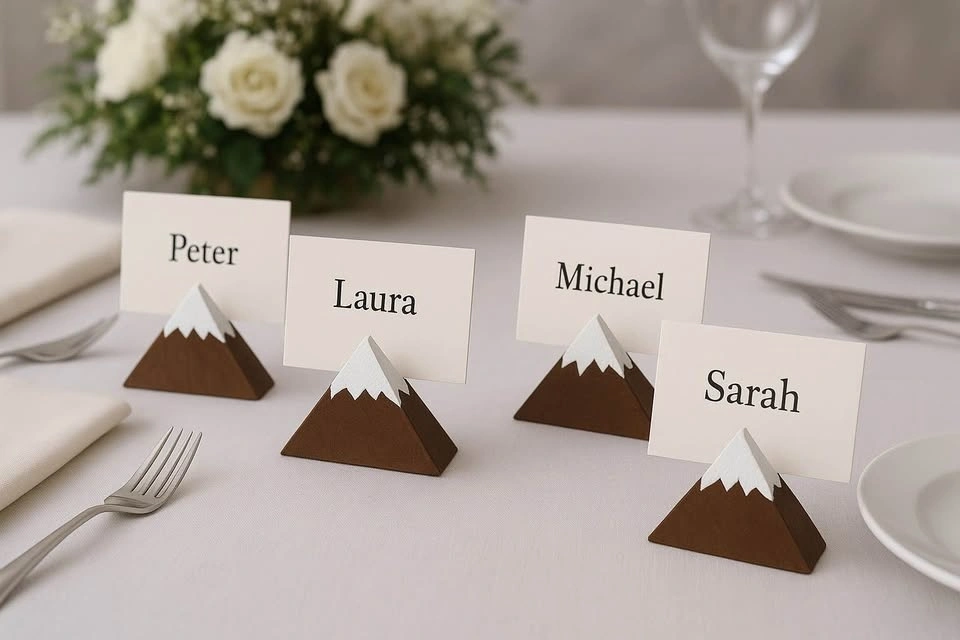 Add some wooden charm and "adventure" to your celebration with these hand-painted mountain-shaped card holders.