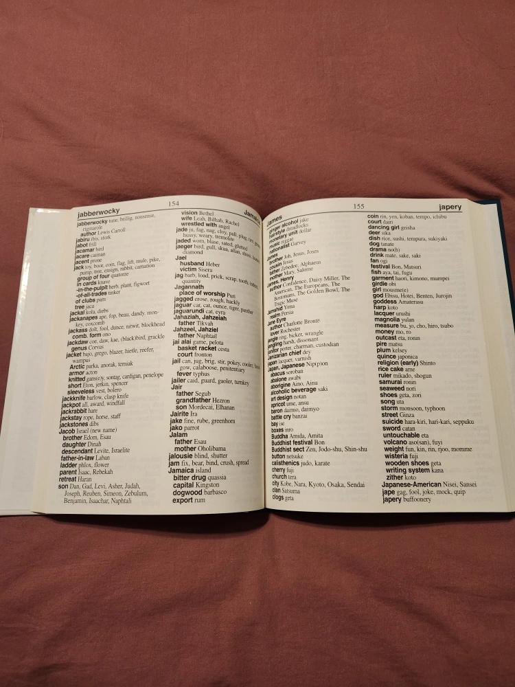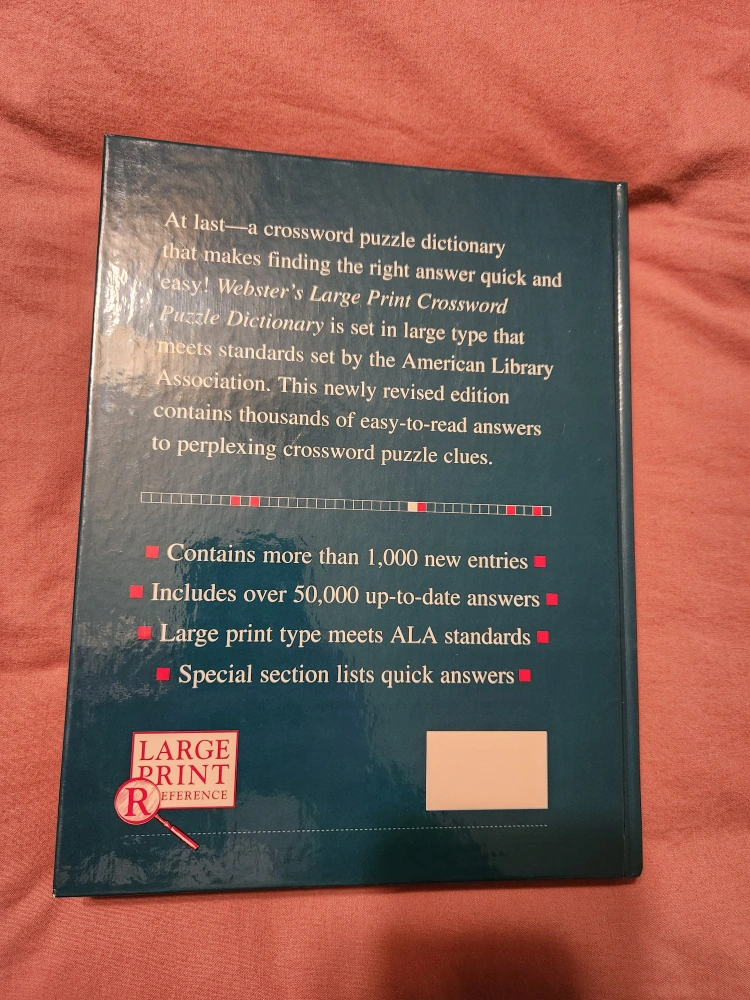 Large print crossword puzzle dictionary. Contains over 50,000 answers. Meets American Library Association standards.